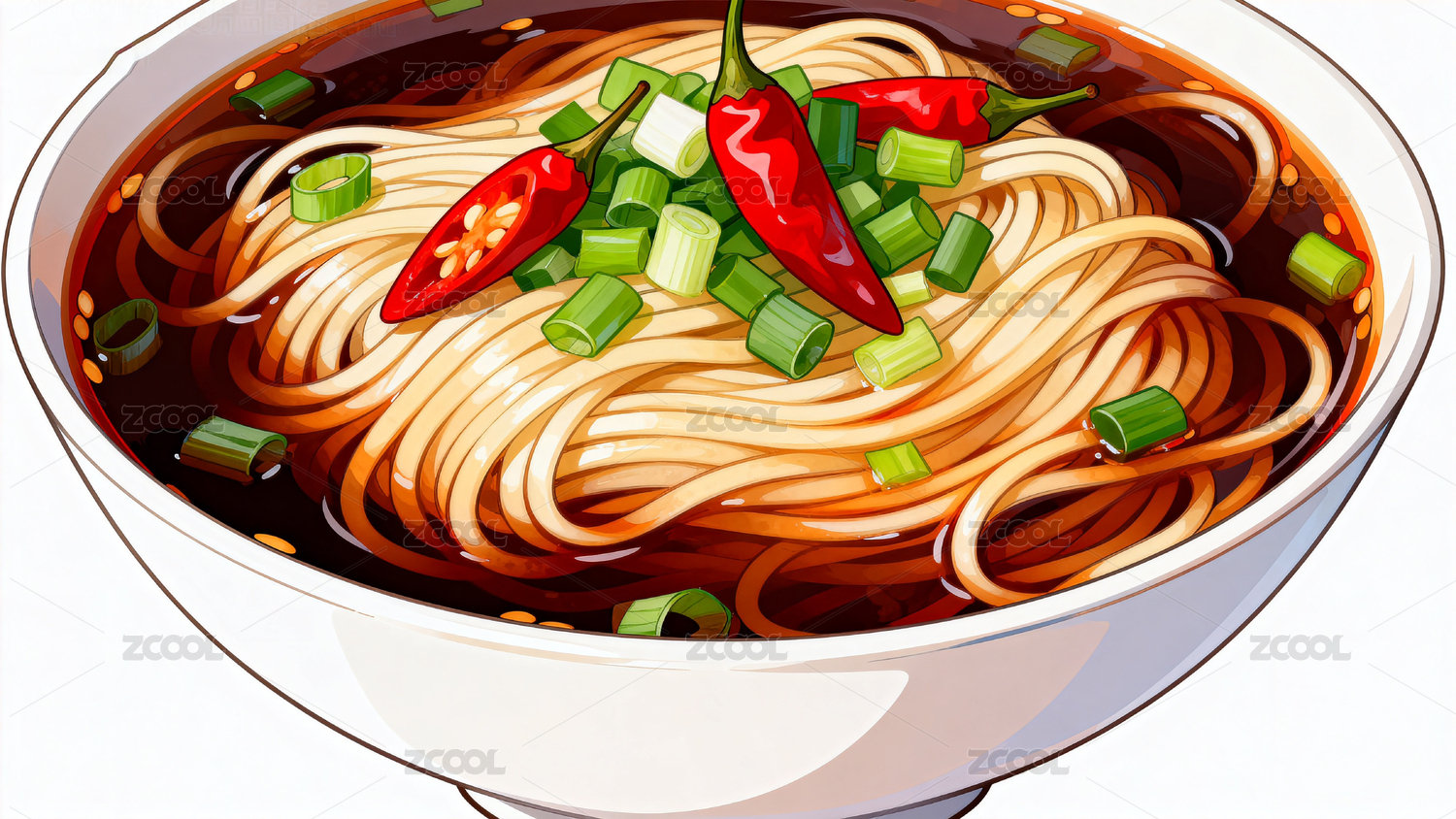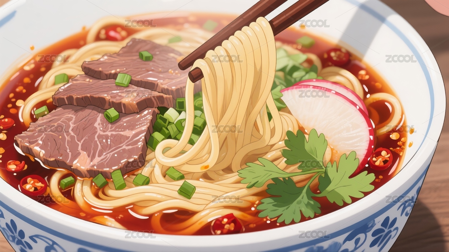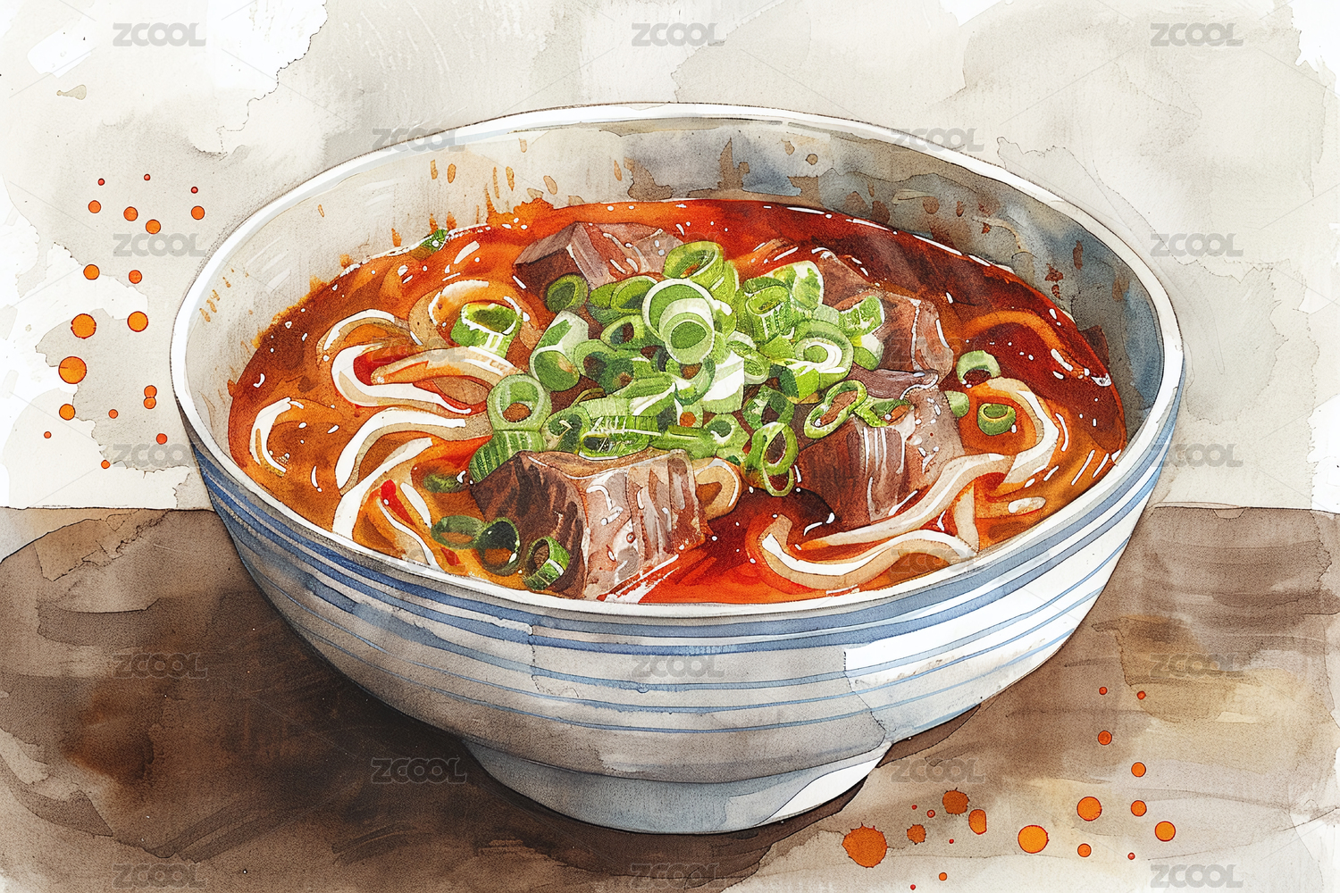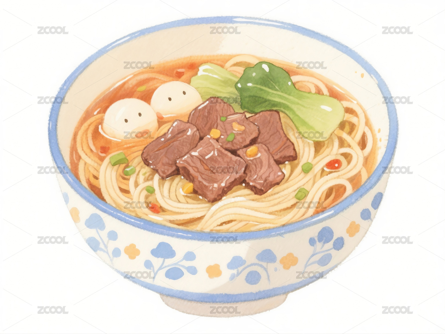 冬季,牛肉面,面条,牛肉,汤,青菜,红辣椒,水彩,插画,美食
