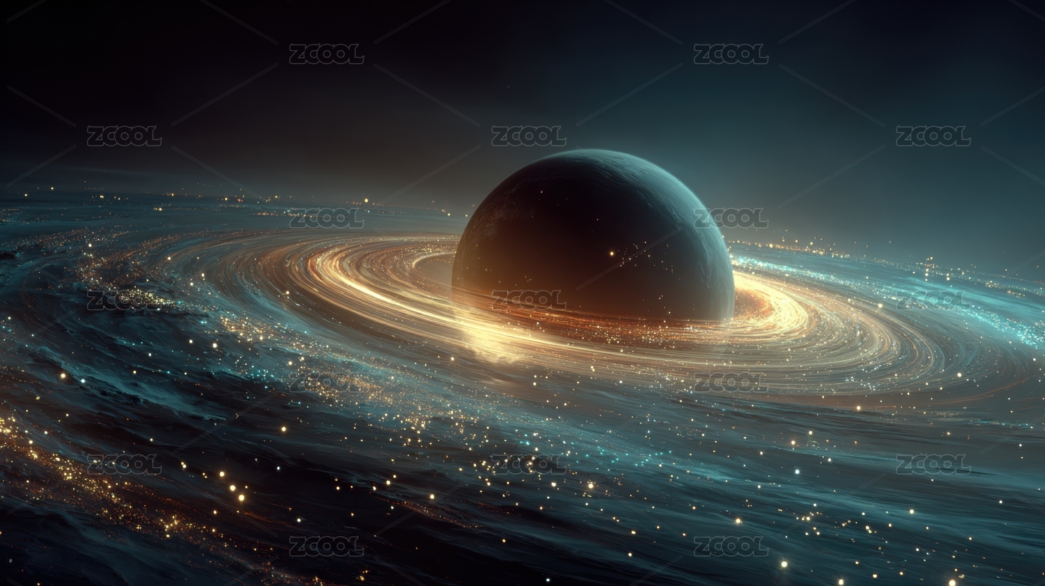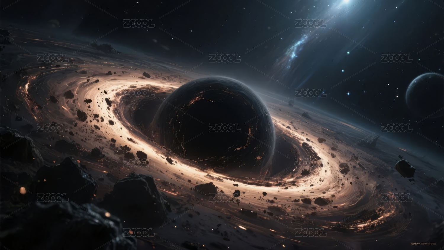 黑洞环绕星系与漂浮陨石的宇宙深空景象