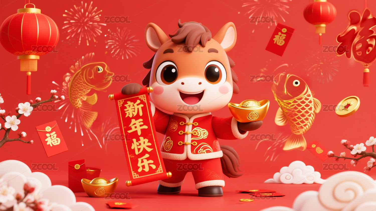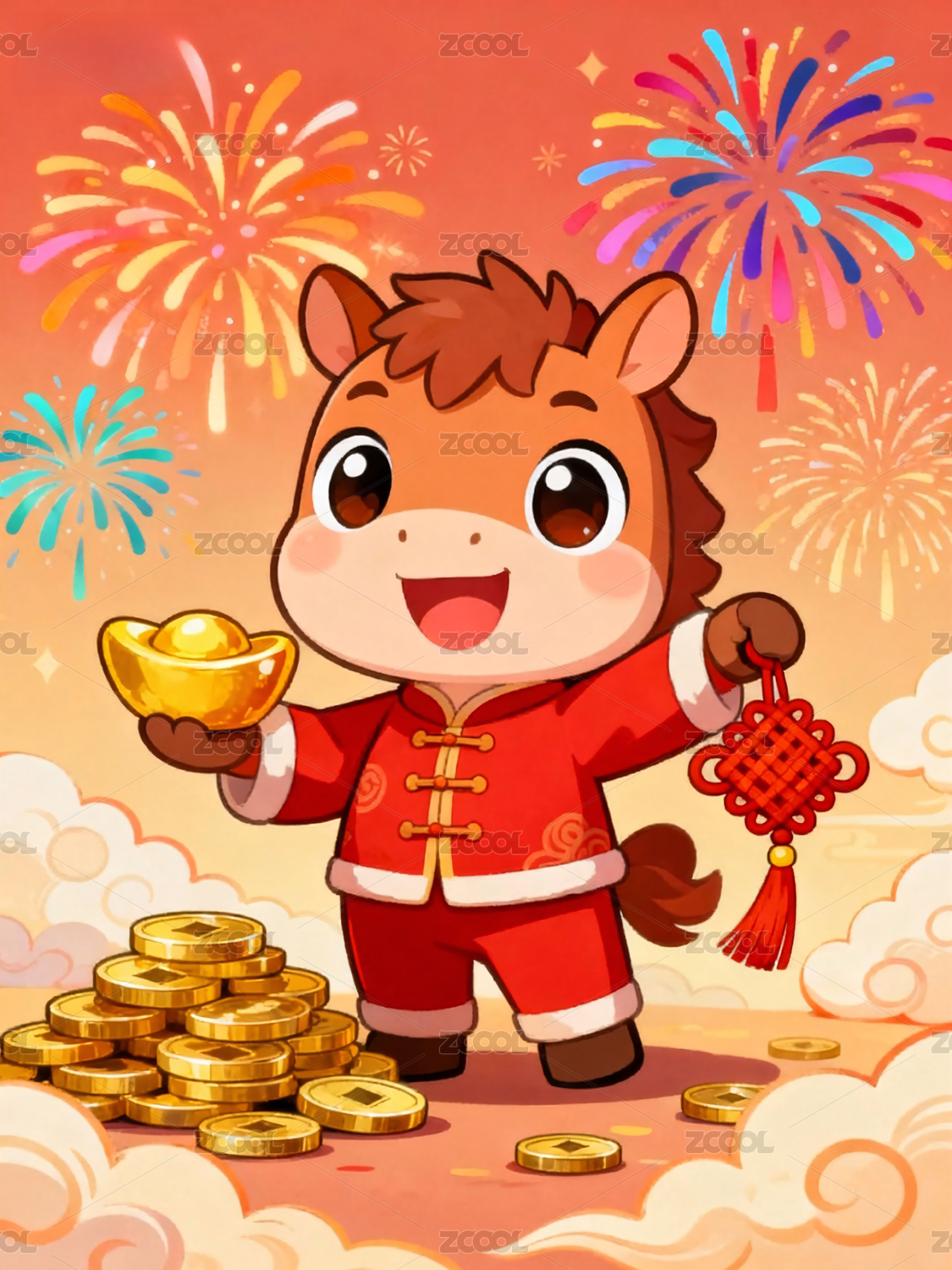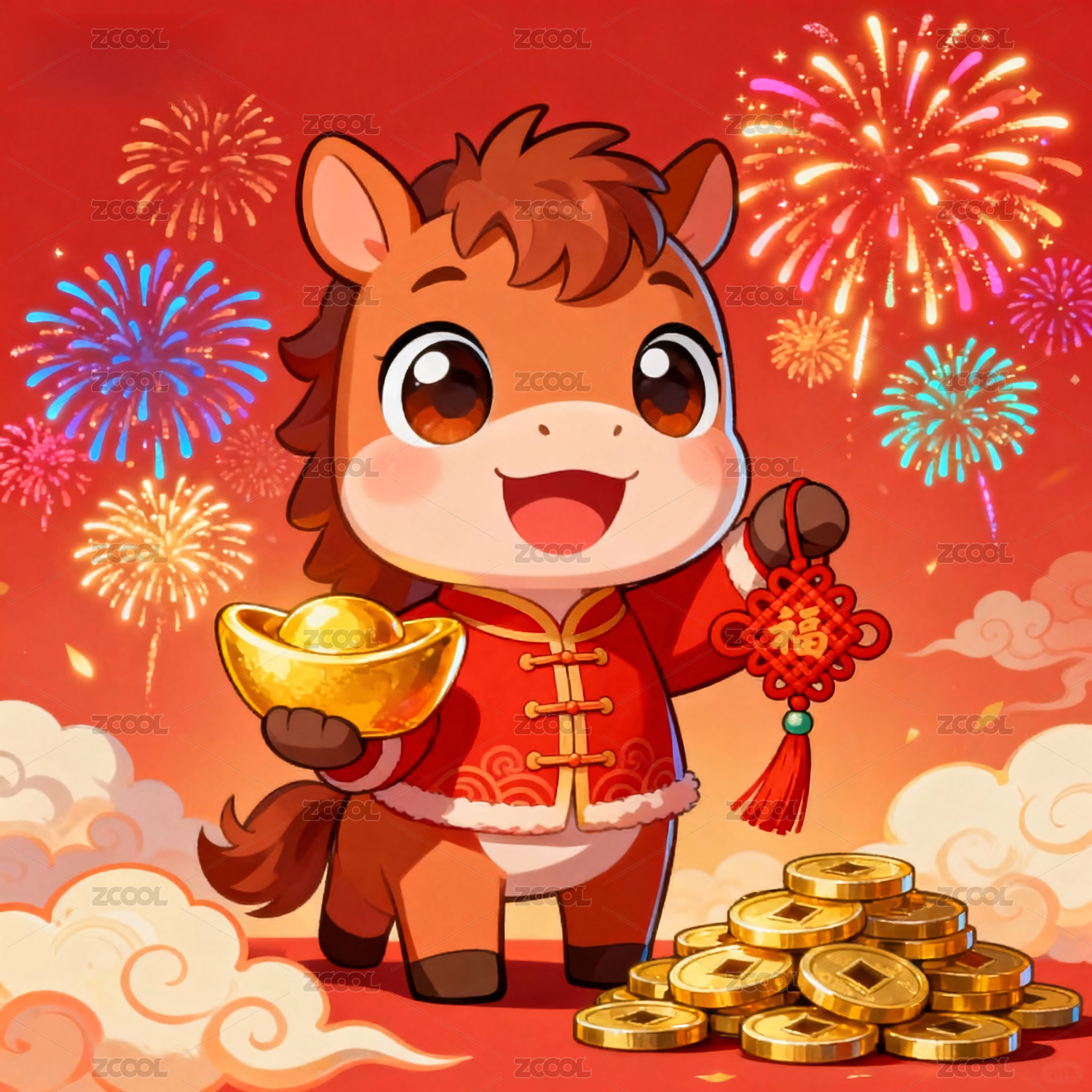 中国新年,卡通小马,招财进宝,红色背景,金色元宝,节日气氛,喜庆,财富,传统元素,烟花