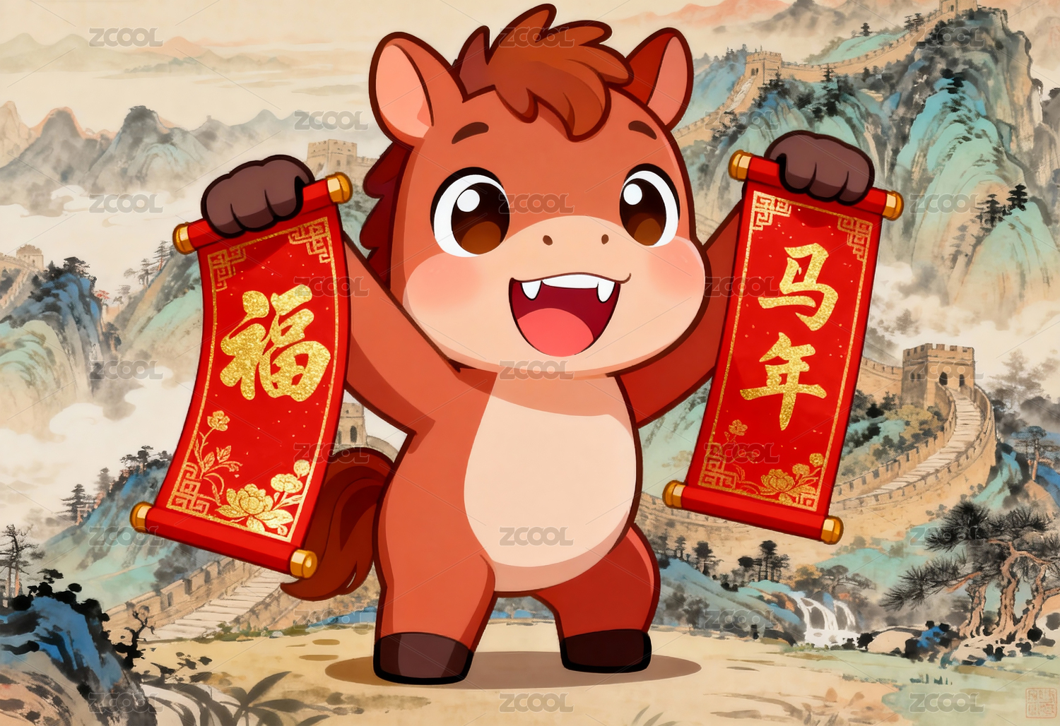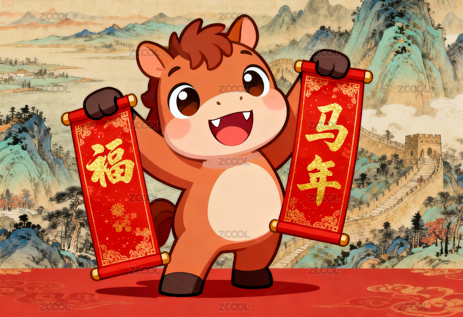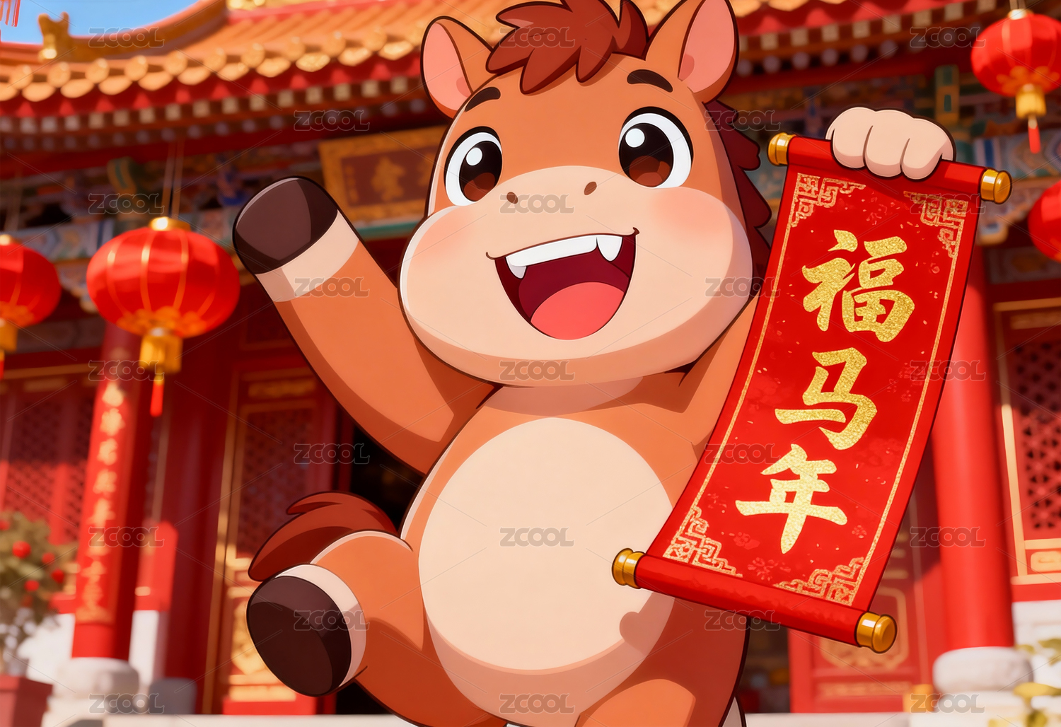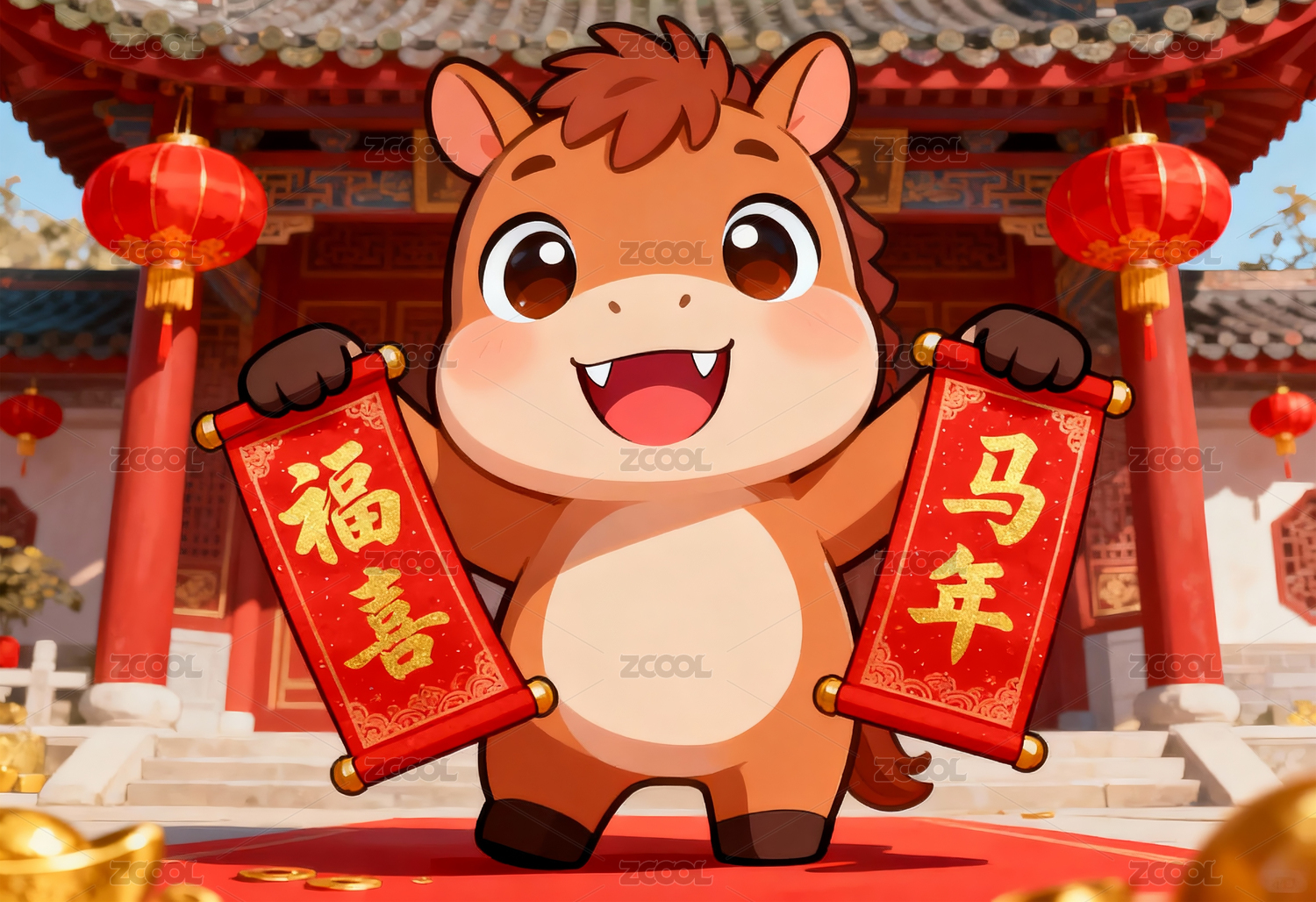 中国新年,卡通小马,招财进宝,红色背景,金色元宝,节日气氛,喜庆,财富,传统元素,烟花