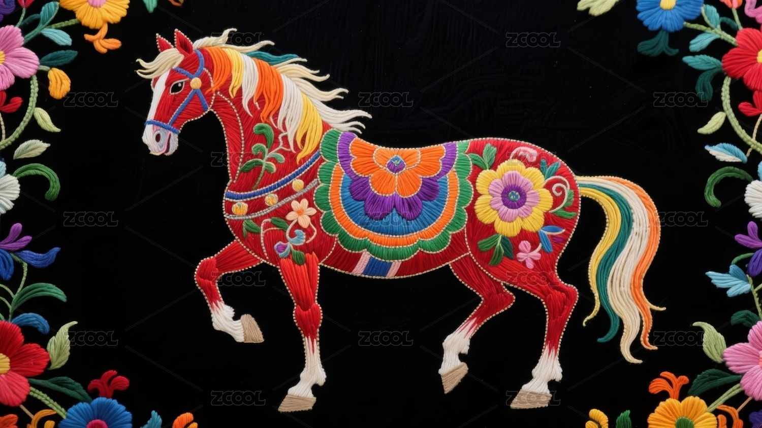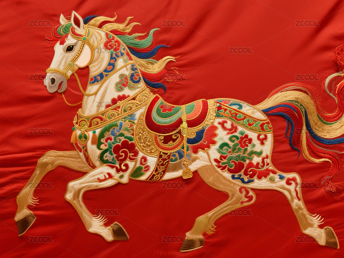 装饰马,华丽设计,艺术马,红色背景,金色装饰,花卉图案,蓝色花纹,动态姿态,文化元素,高贵优雅