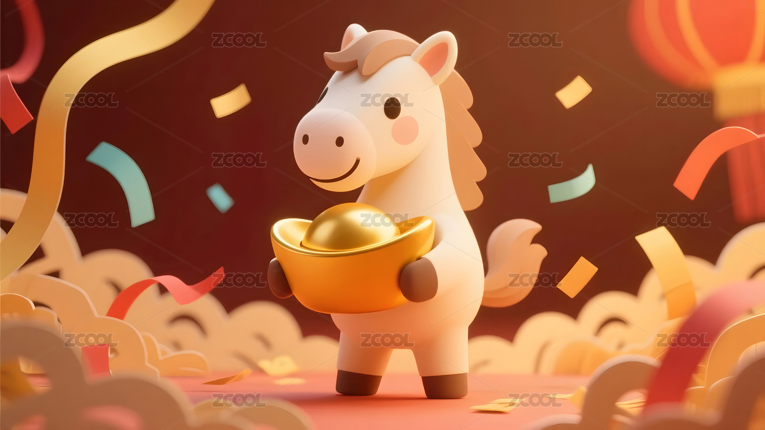 新春场景中卡通马怀抱元宝