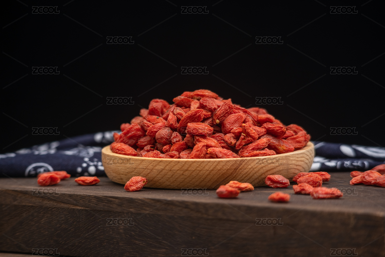 桌面木盘里放满晒干的中药材枸杞子食品原料
