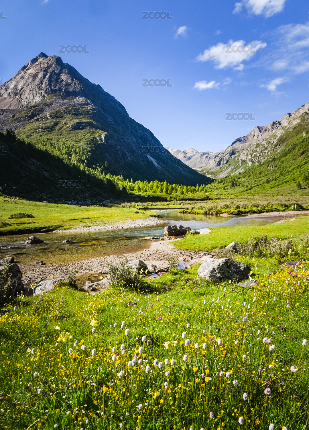 高山,草甸,河流,山谷,草原,蓝天白云,绿色植被,自然风光,风景摄影,生态