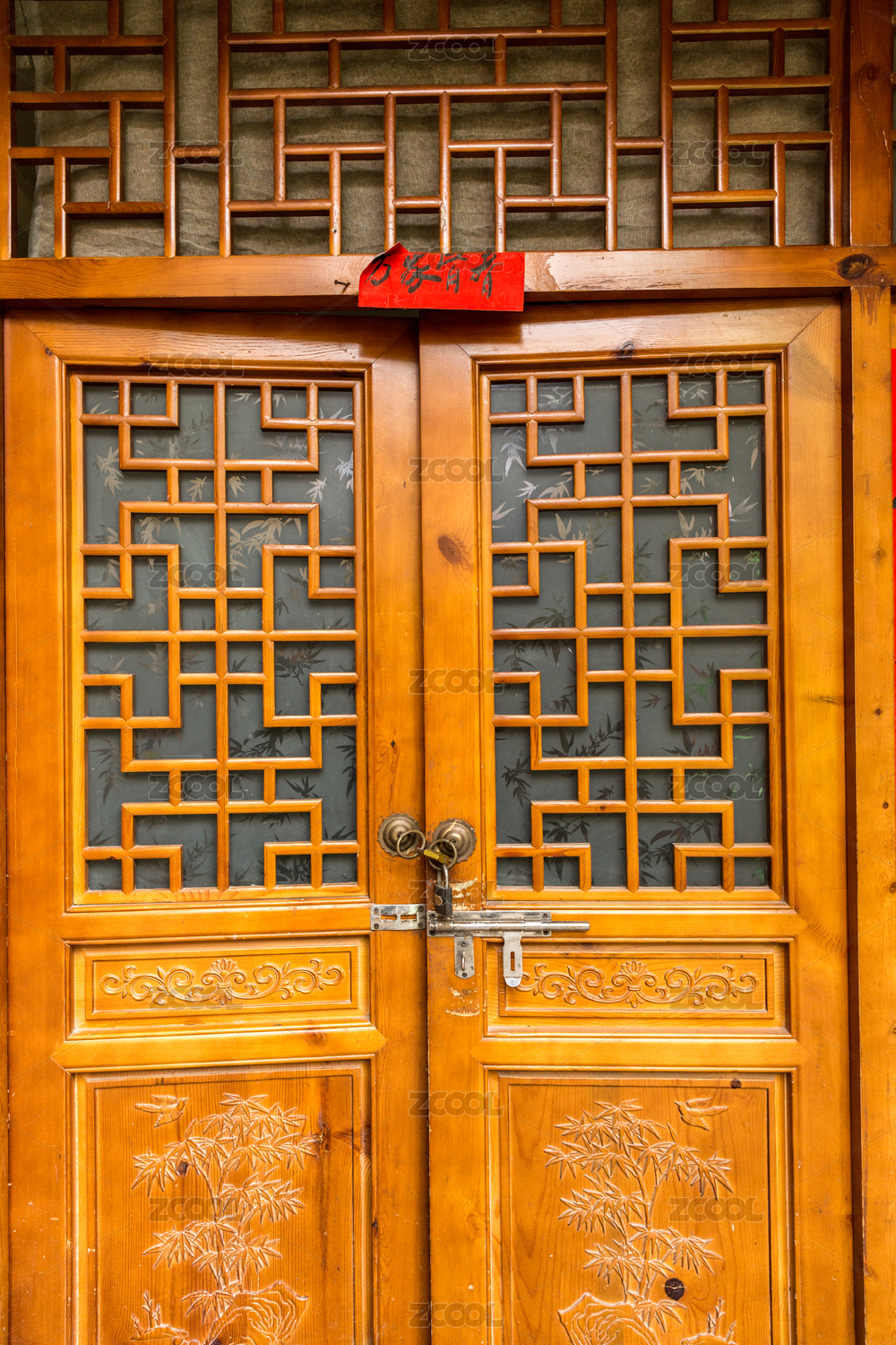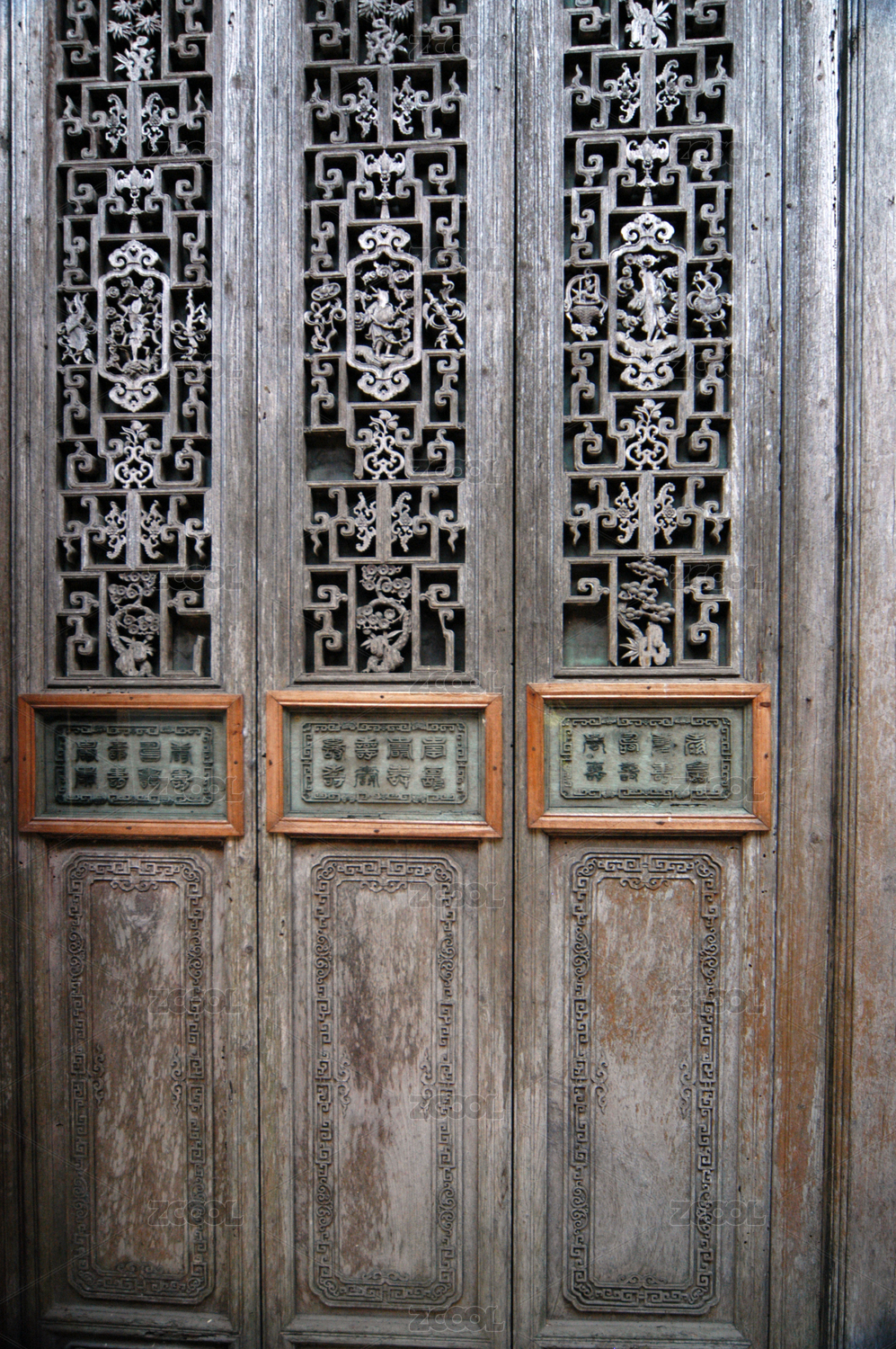 中国浙江省新昌县梅渚古镇古建筑木门特写
