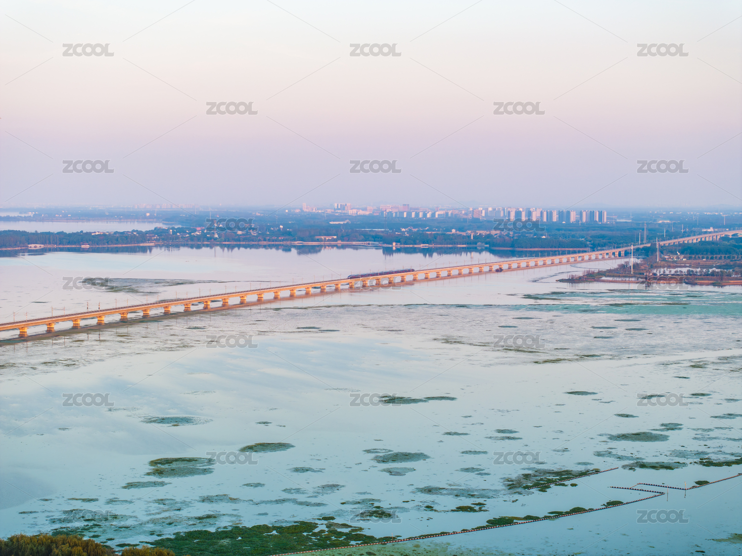 现代高铁穿越水面桥梁的画面