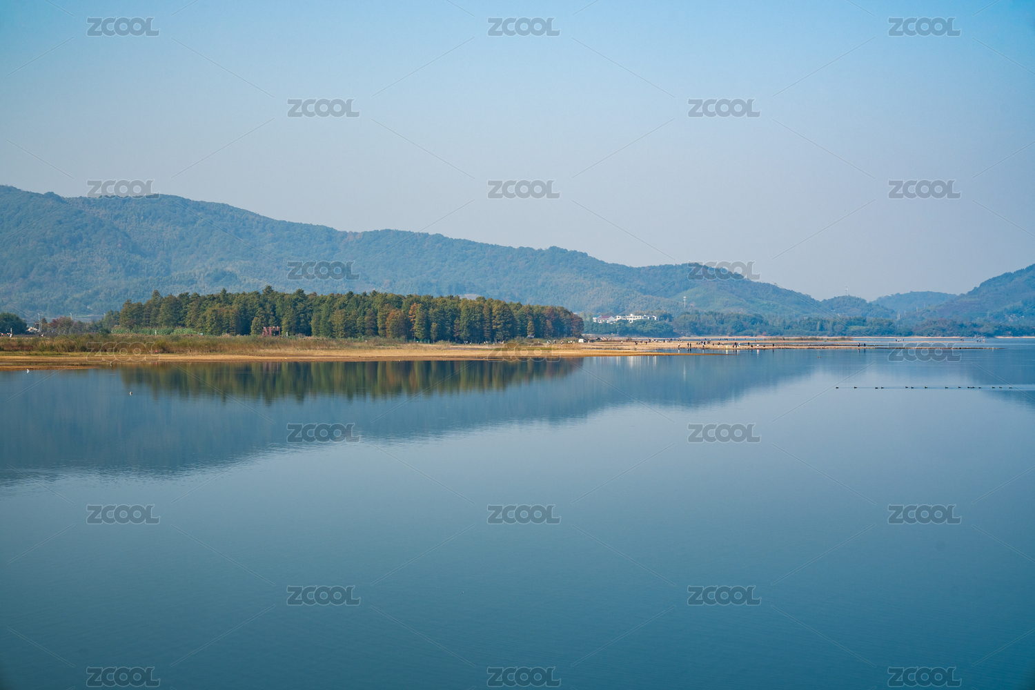 四明湖,湖泊,小岛,山水,自然风光,蓝天,平静水面,远山,风景,自然景观
