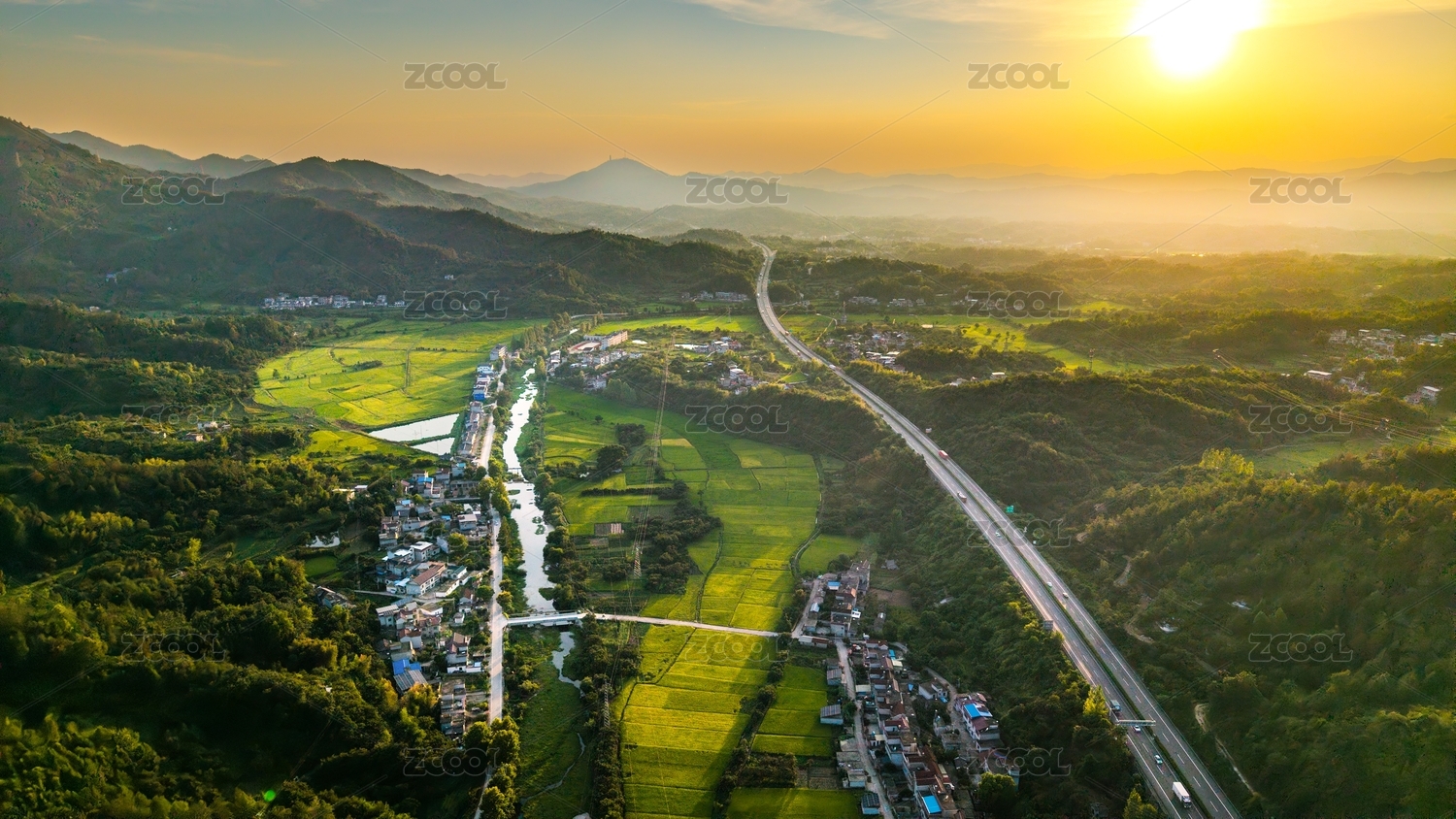 航拍日落下的黄岩区新农村美景