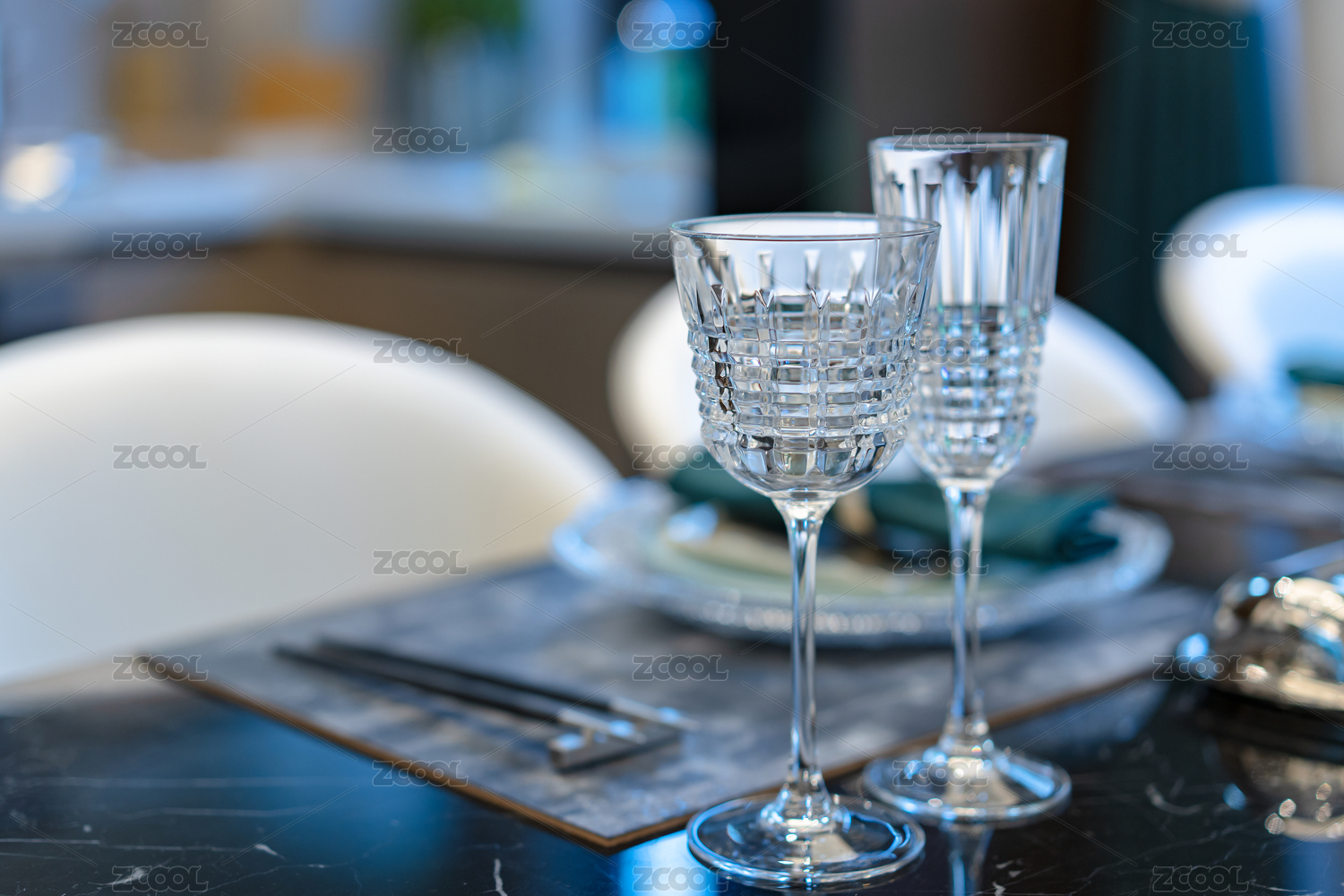 大理石餐桌台面上摆放的玻璃杯及其他餐具
