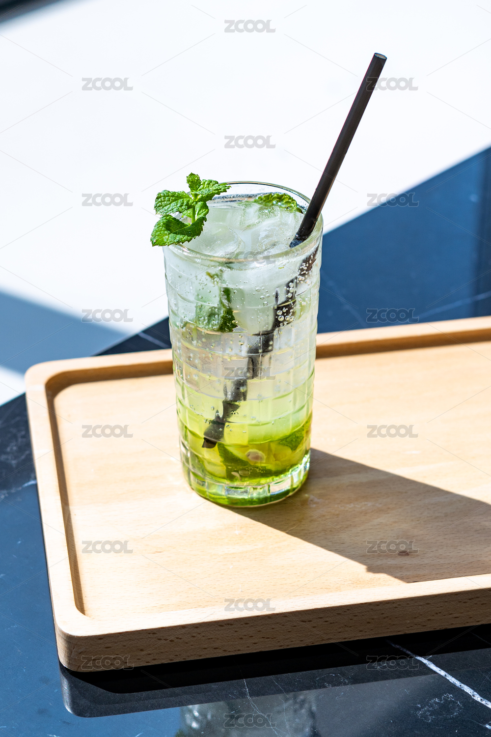 桌面上的杯子里的甘甜可口的冰冻油甘茶