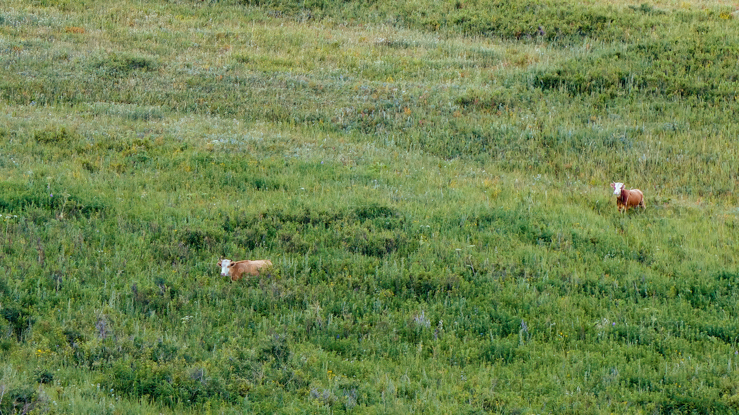 中国新疆布尔津禾木村旁在草丛中张望的牛