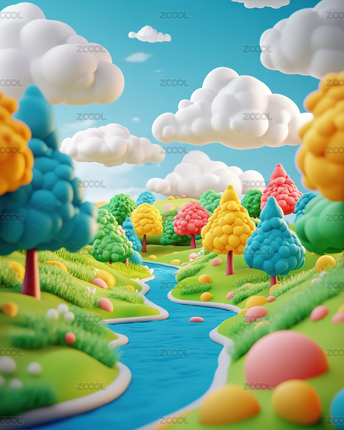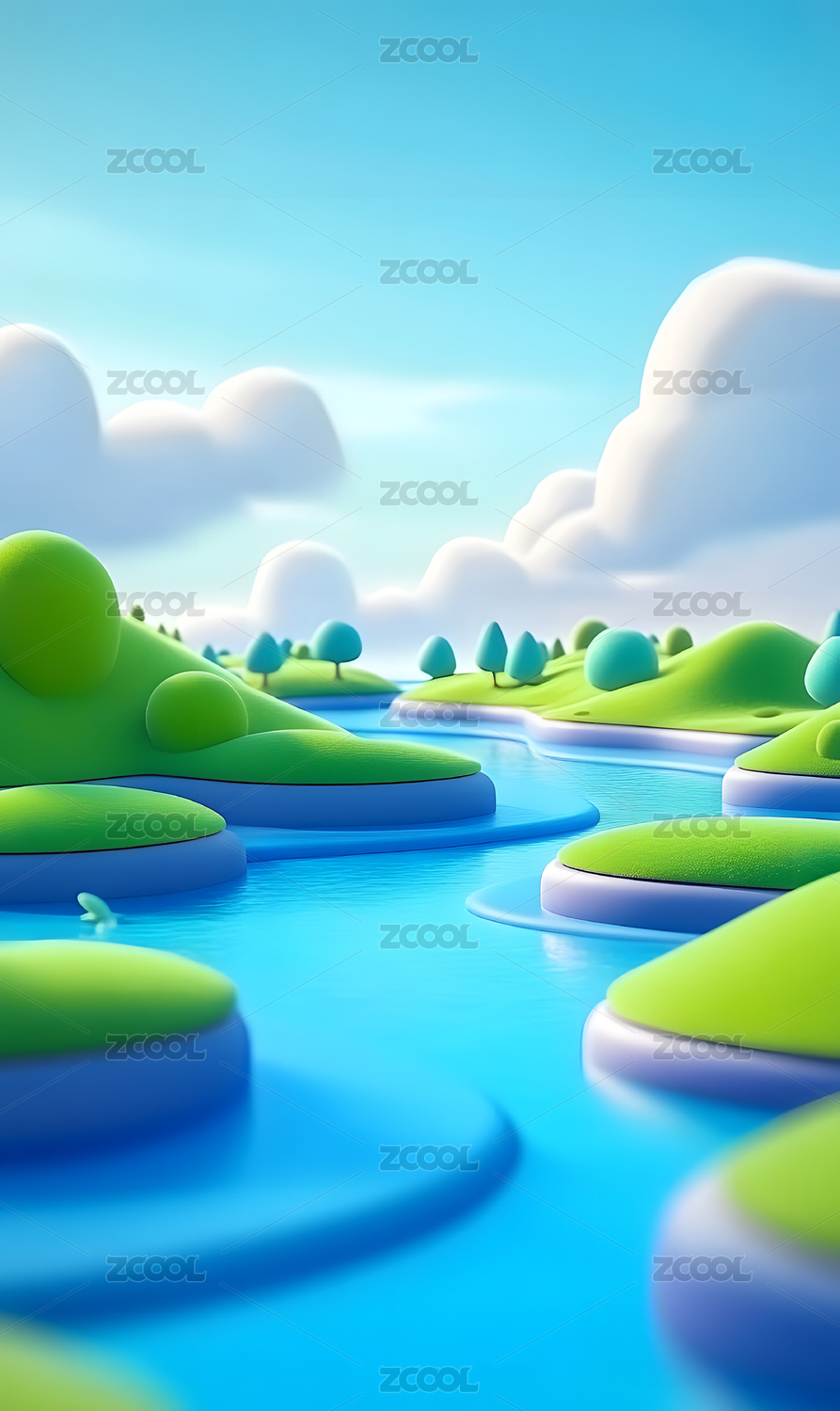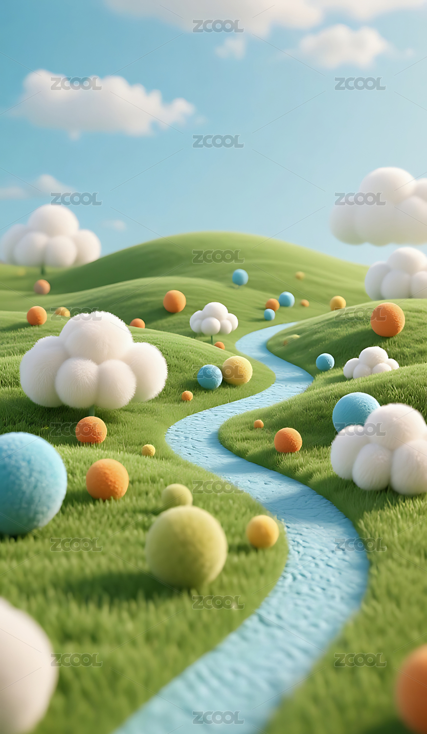 3D,卡通,抽象,自然,户外,背景,草地,草原,天空,云朵