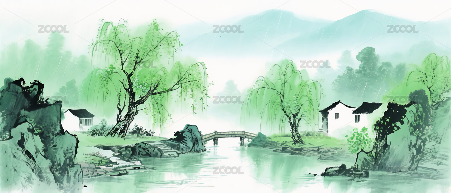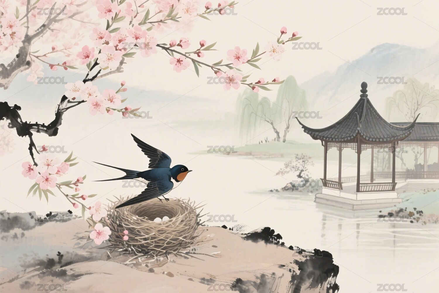 自然,枝条,山峦,传统,樱花,绿叶,云雾,远景,和谐,静谧