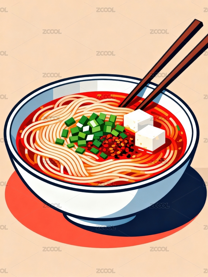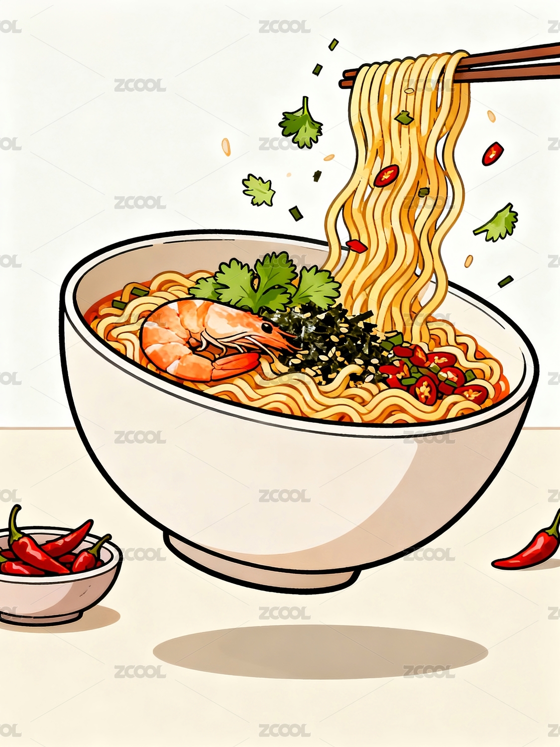 筷子挑起一碗诱人的米粉面条干拌面小吃手绘