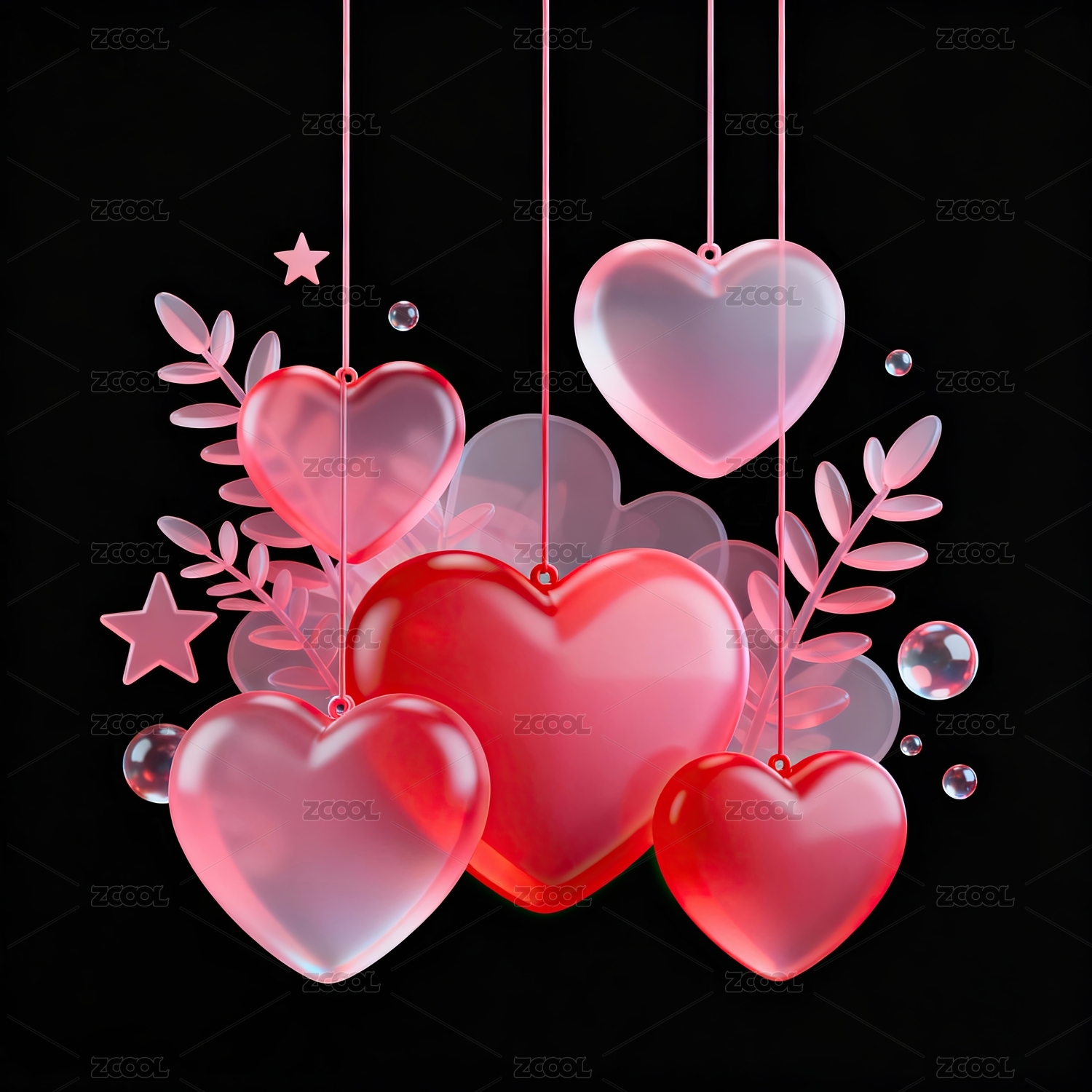 黑色,背景,心形,悬挂,粉色,透明,星星,叶子,装饰,光泽