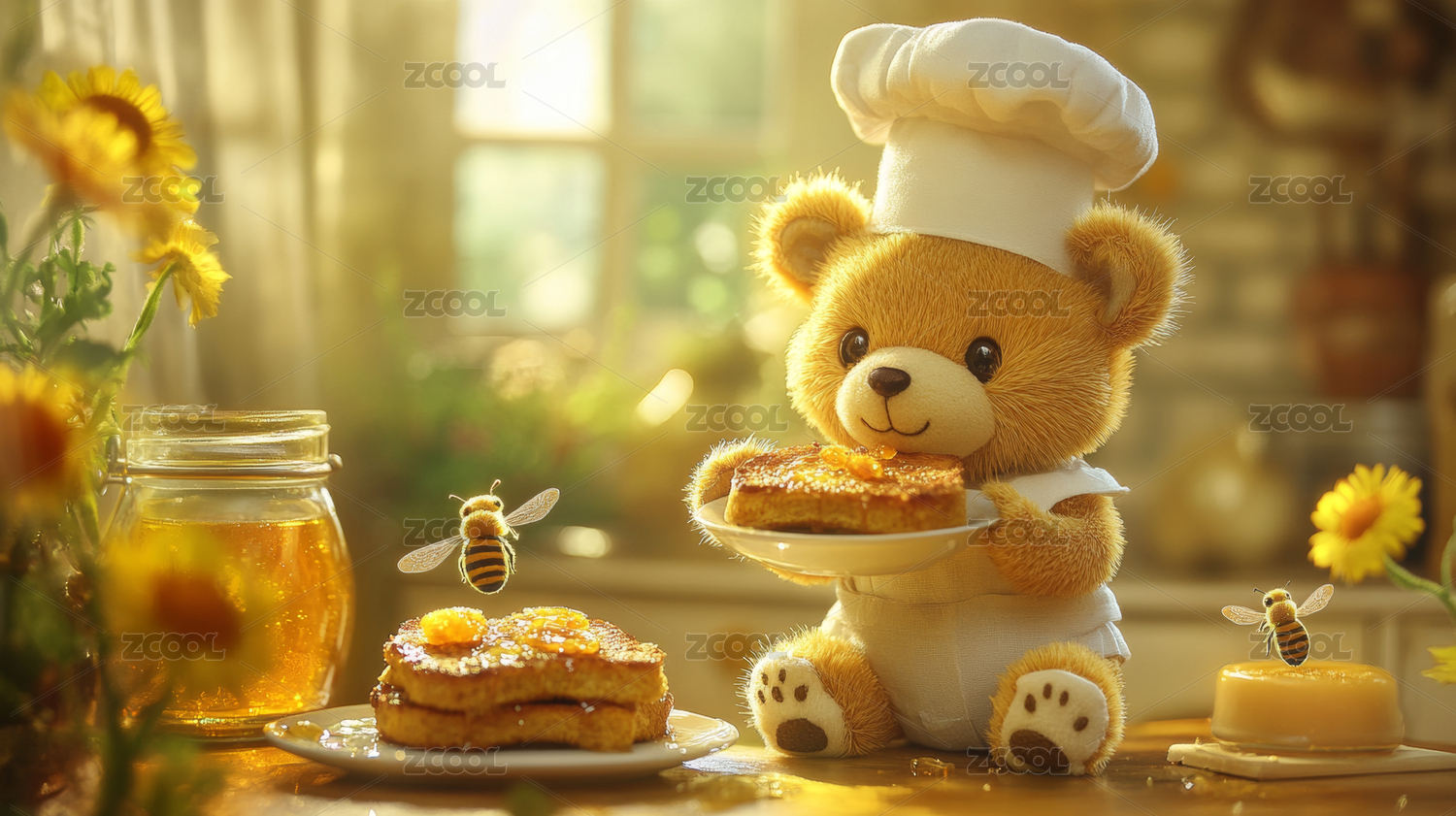 小熊,厨师,蜜蜂,面包,厨房,温馨,烹饪,烤箱,吐司,卡通