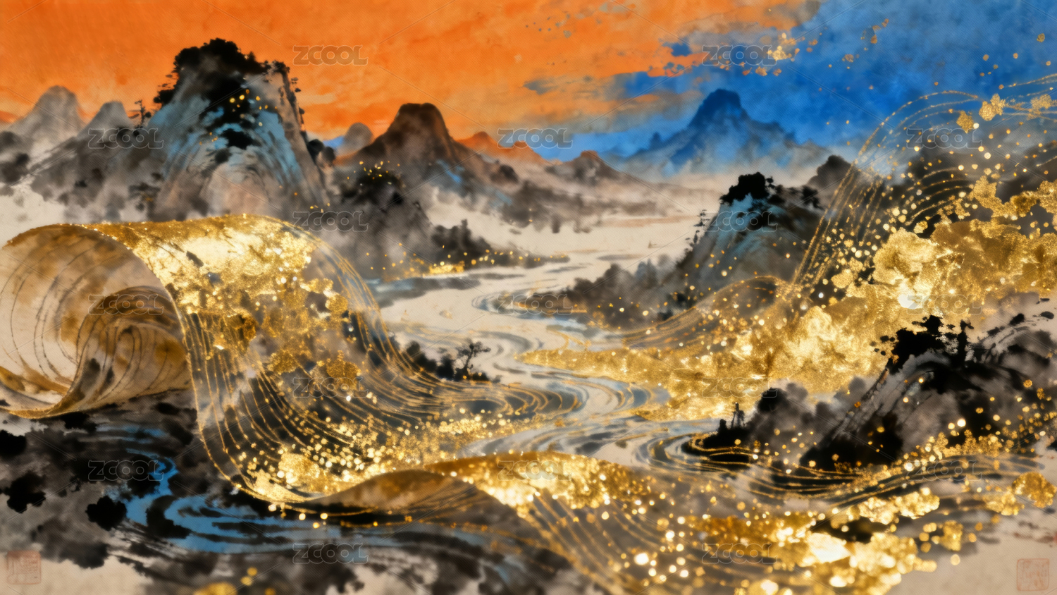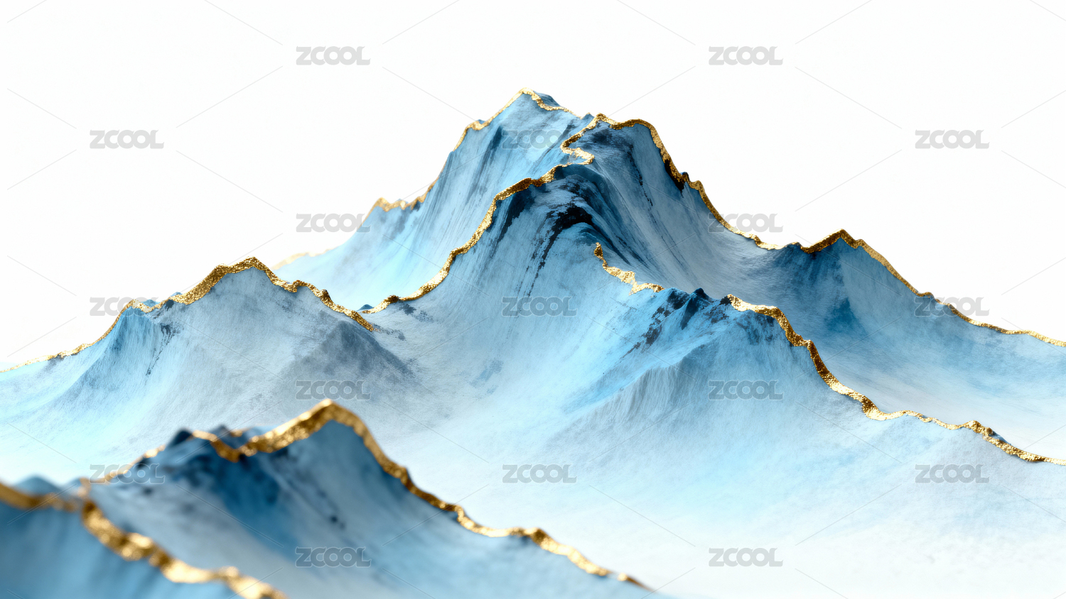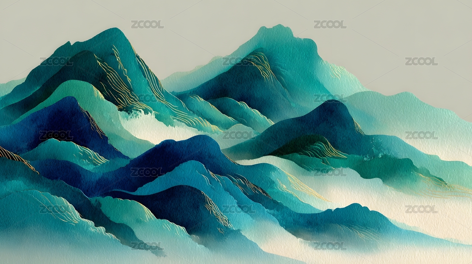 极简,蓝色,立体,山水画,金边,艺术,背景