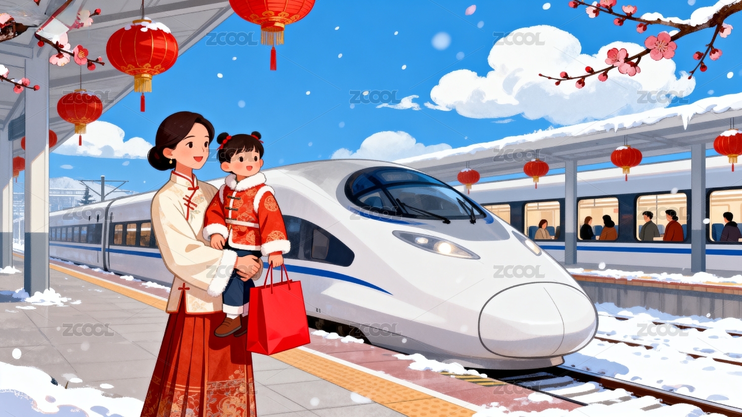 新年,红色,庆祝,花朵,千里江山,水墨画,国潮,高铁,动车,灯笼