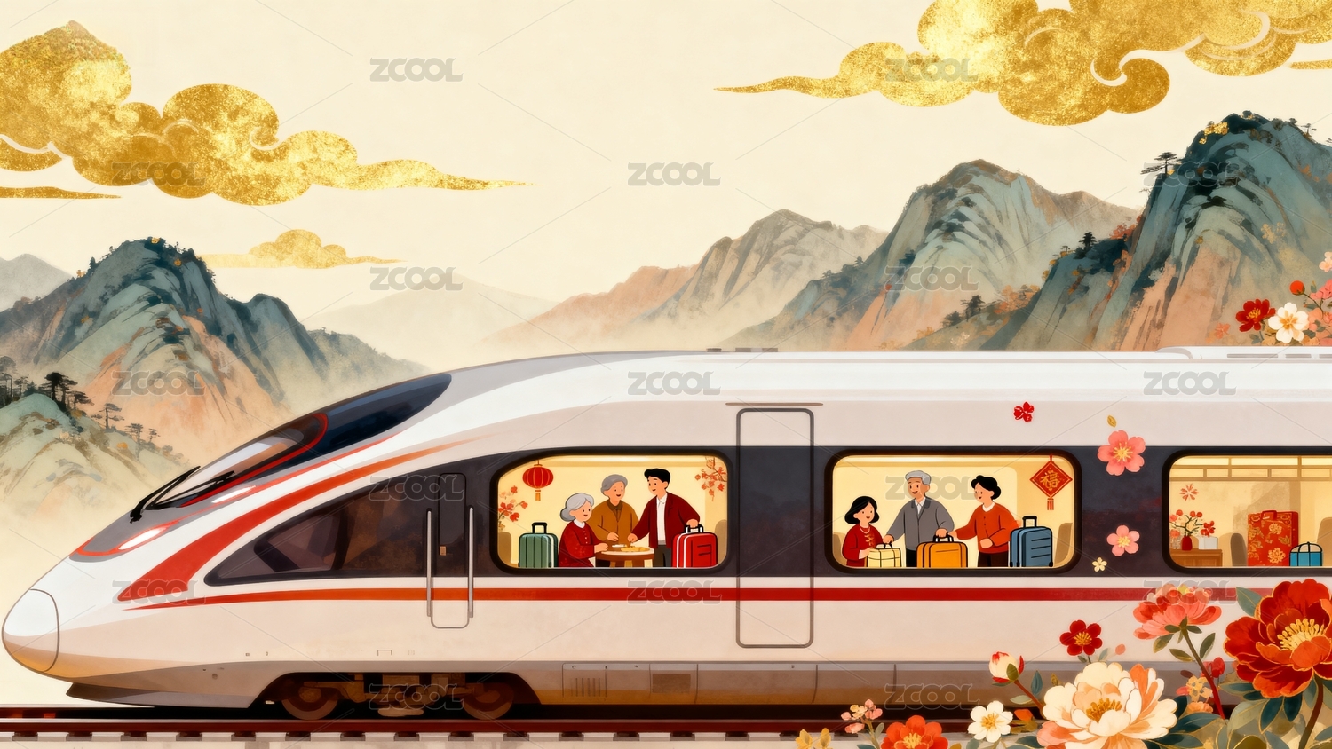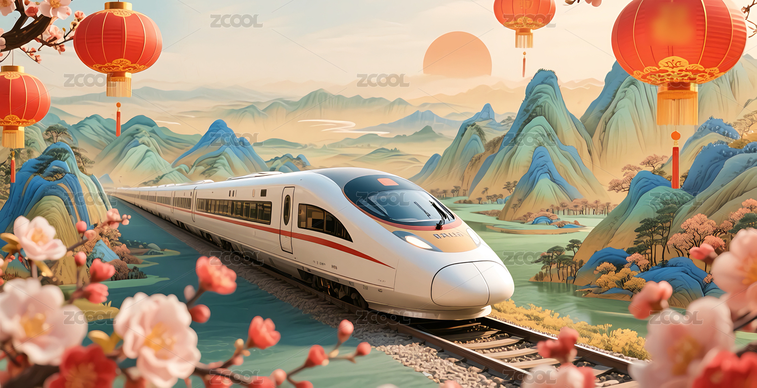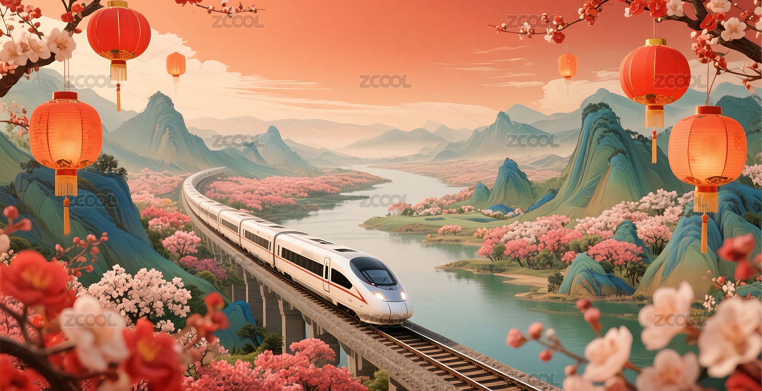 新年,红色,庆祝,花朵,千里江山,水墨画,国潮,高铁,动车,灯笼