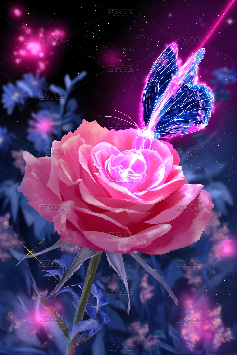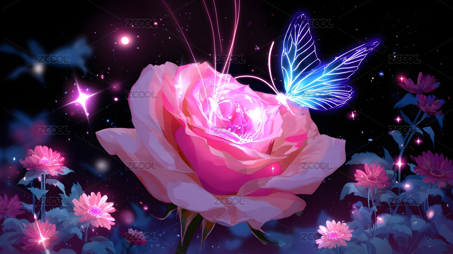 光点,蓝色,紫色,奇幻,梦幻,绽放,美丽,玫瑰,蝴蝶,花朵