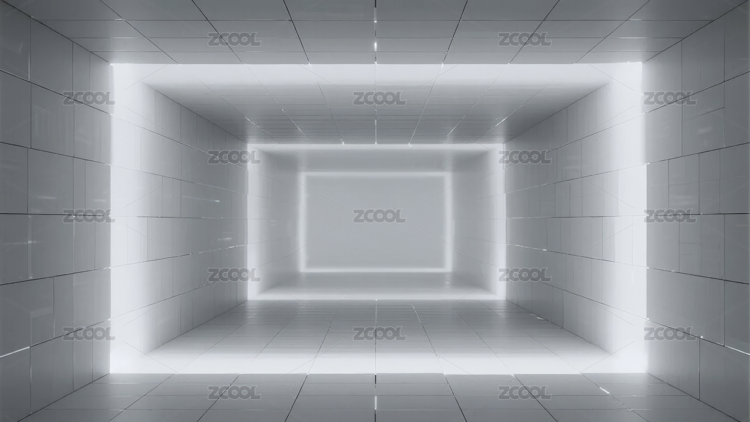 白色未来科技隧道:充满对称美学和霓虹灯光