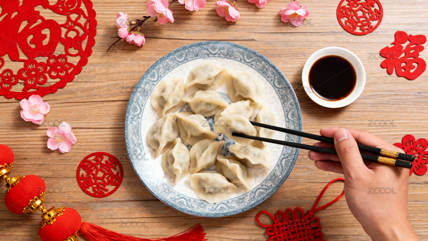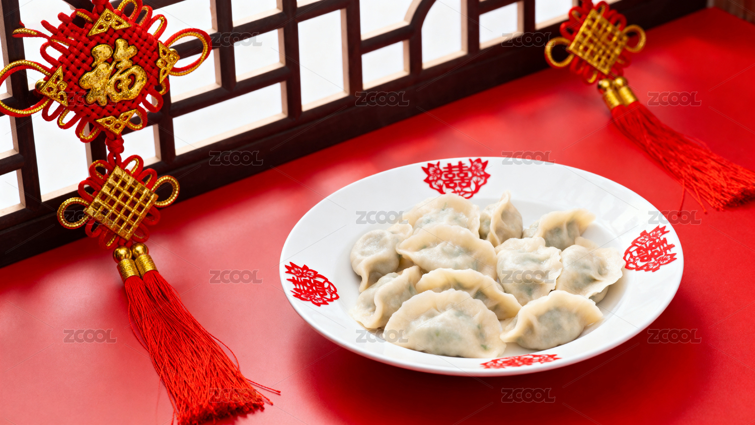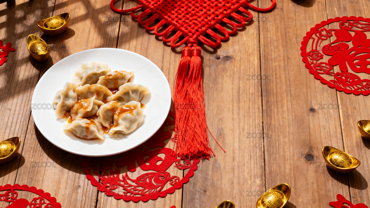 室内棚拍福字福袋中国风背景下的煮熟的饺子