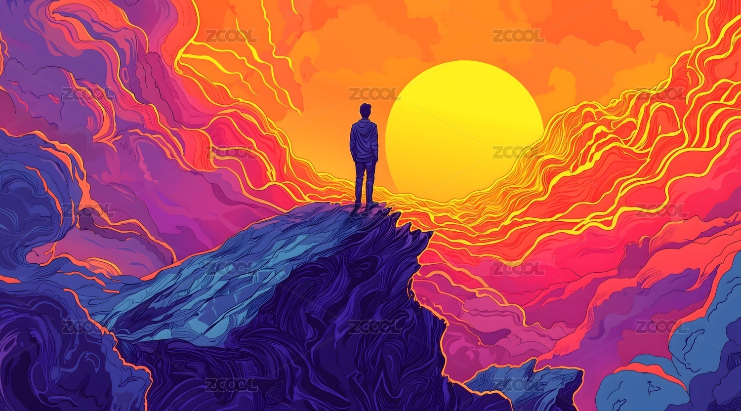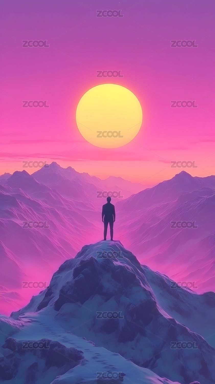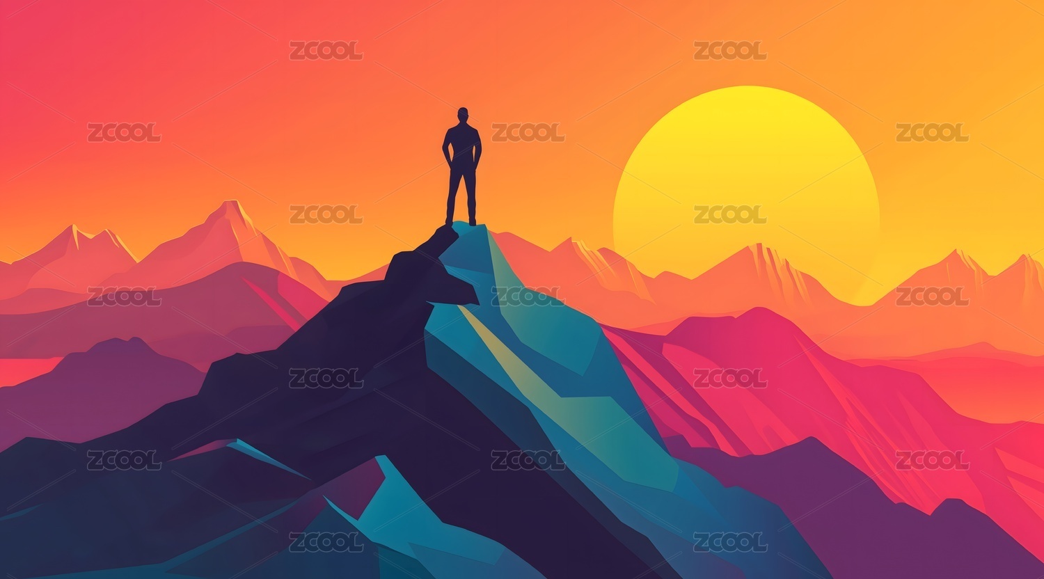 山间日落的孤独剪影 橙色天空下的静谧山景
