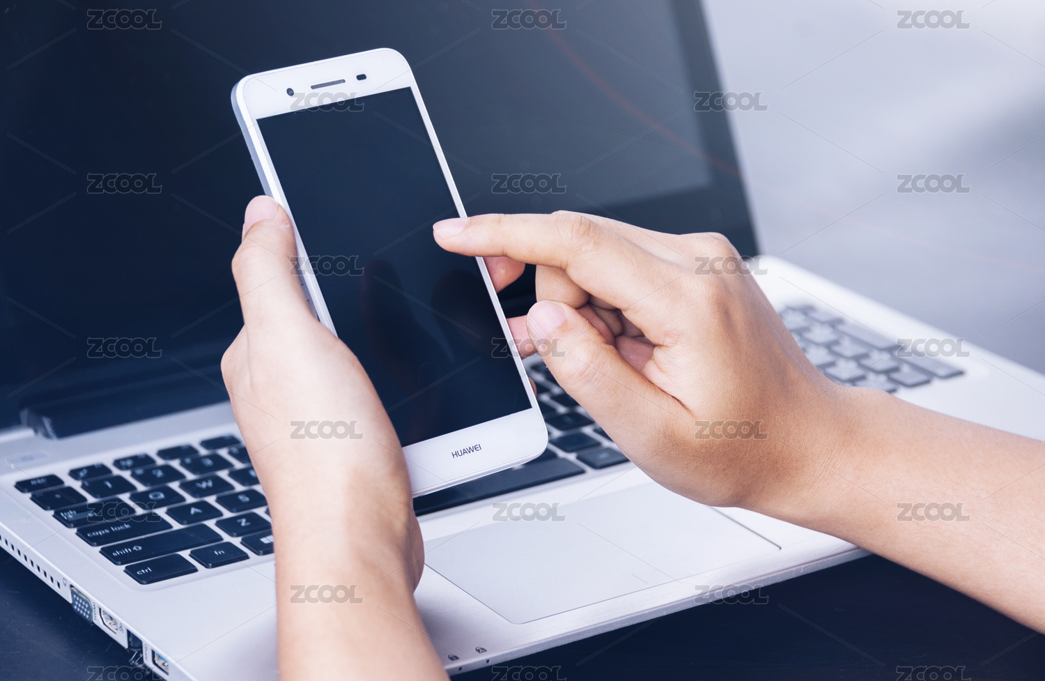 手拿手机使用笔记本电脑