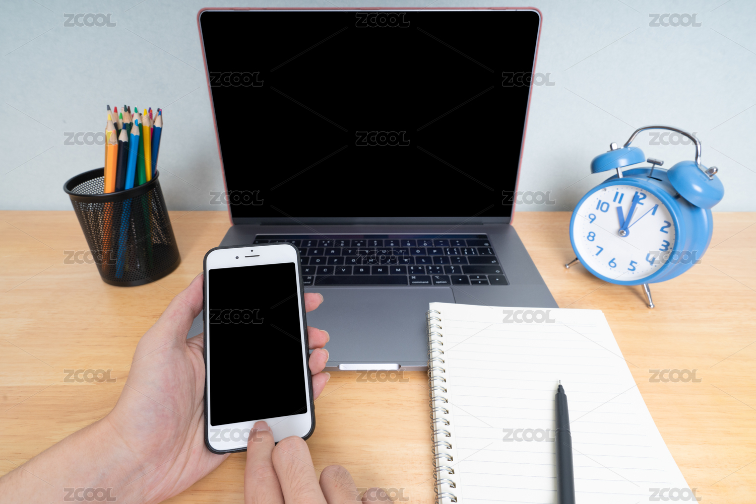 实木条纹桌面上的笔记本电脑手机彩色铅笔