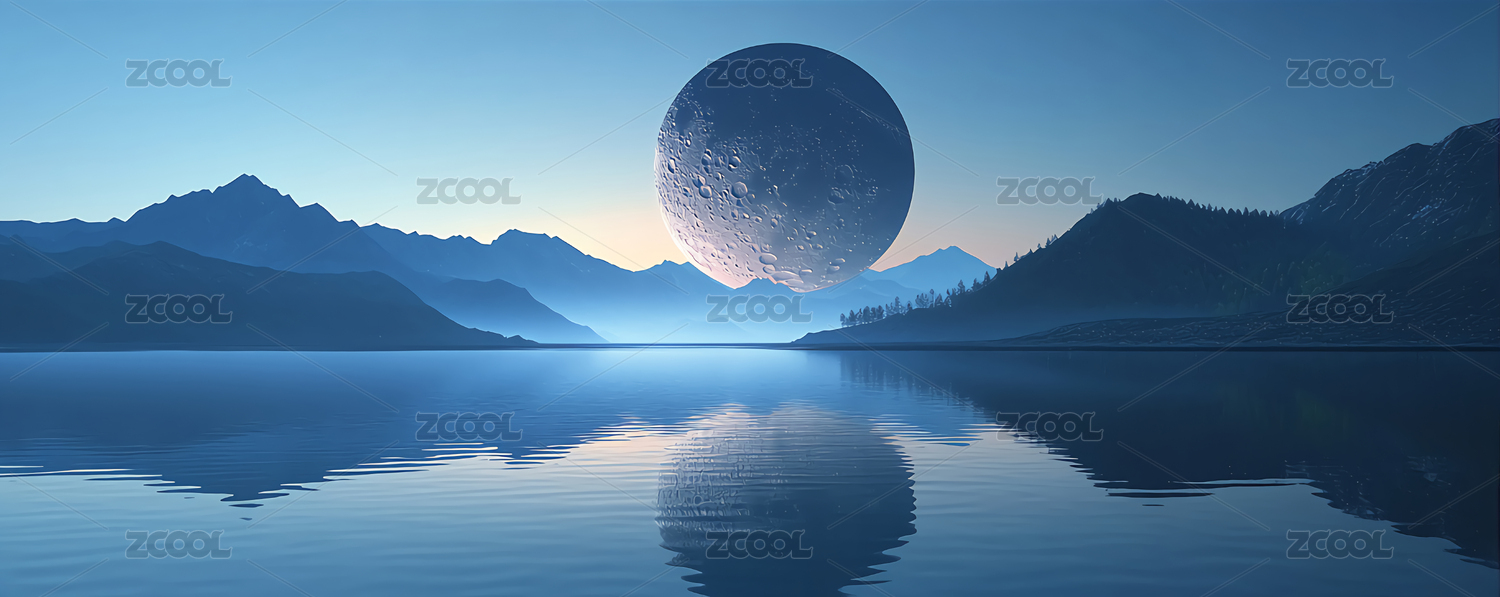 夜晚空中的月亮,山川和湖泊,抽象背景
