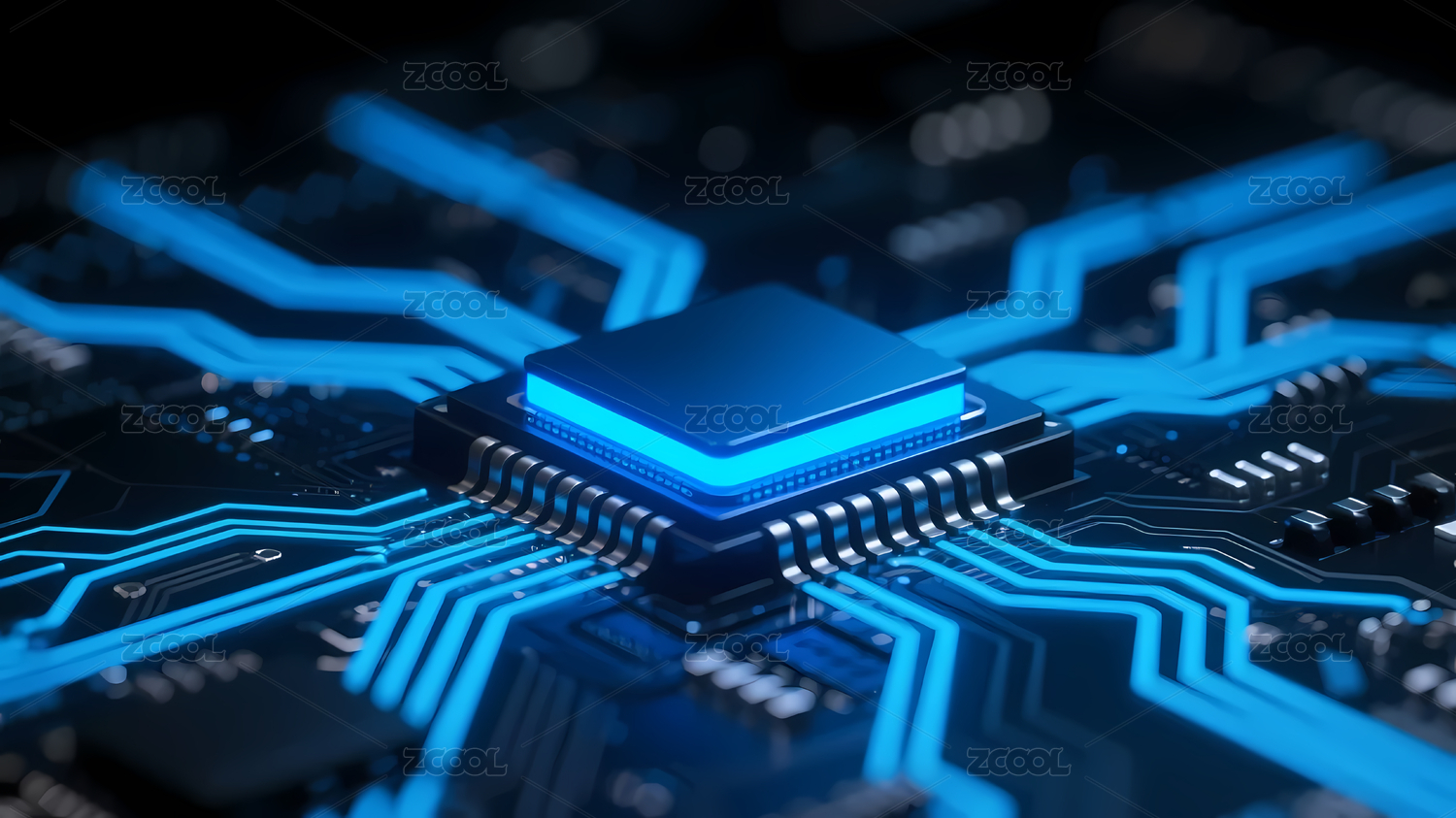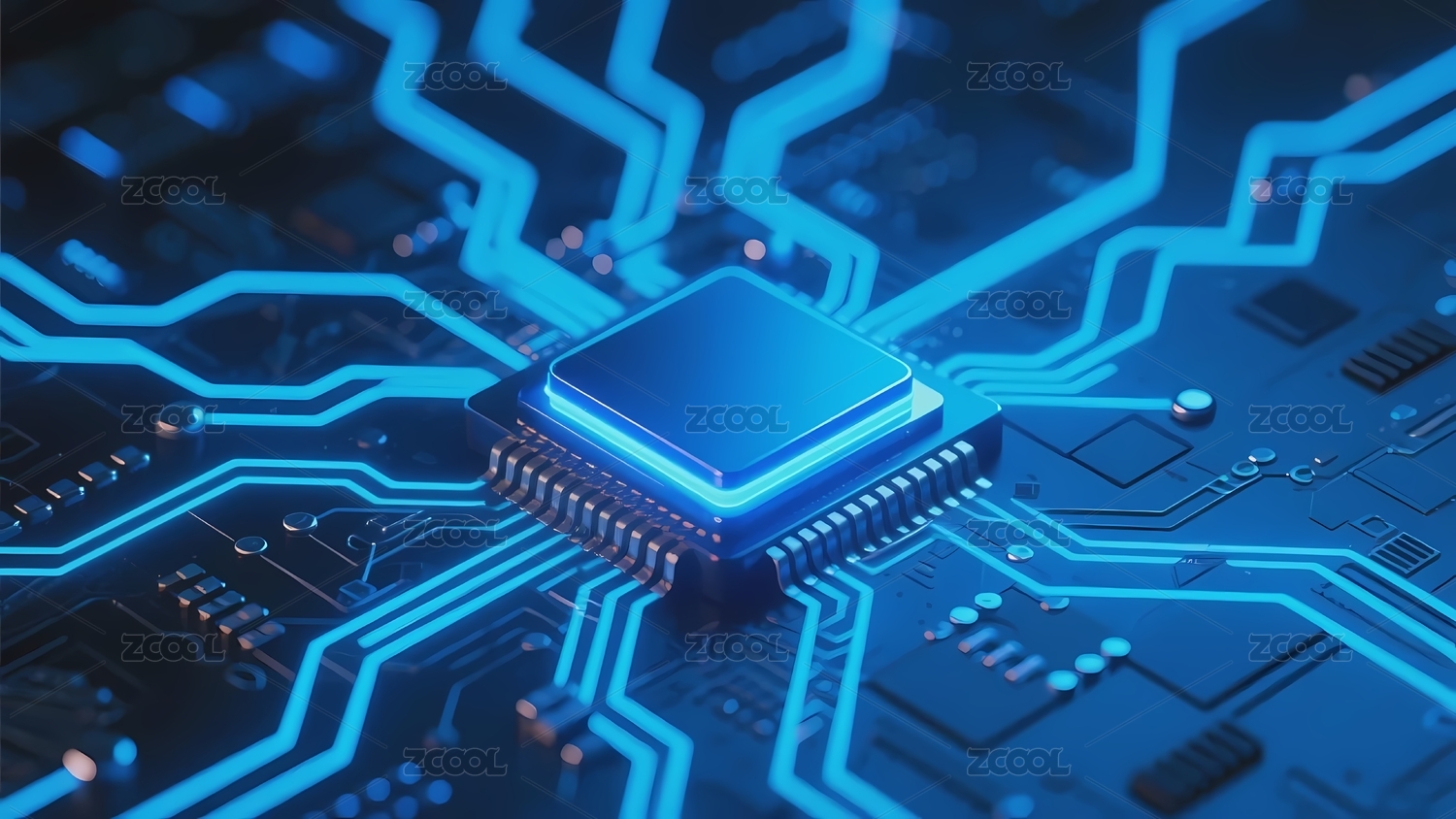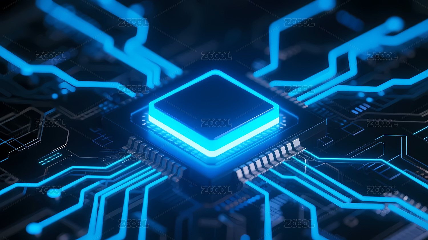 人工智能,电路板,芯片,空间,三维,蓝色,光影,数据流,传输,商务