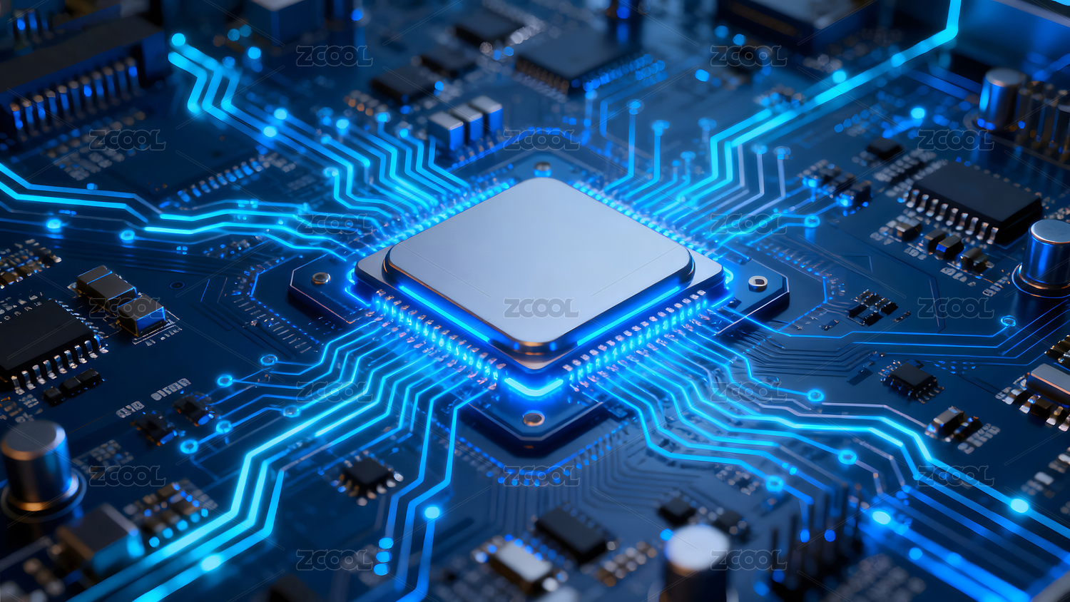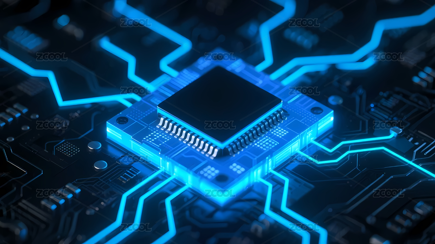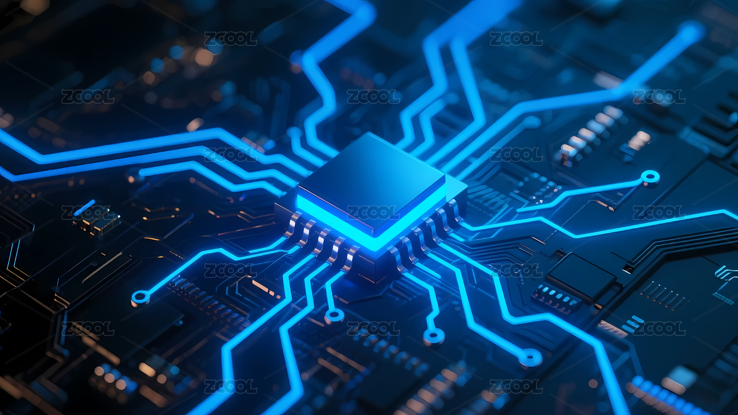 人工智能,电路板,芯片,空间,三维,蓝色,光影,数据流,传输,商务