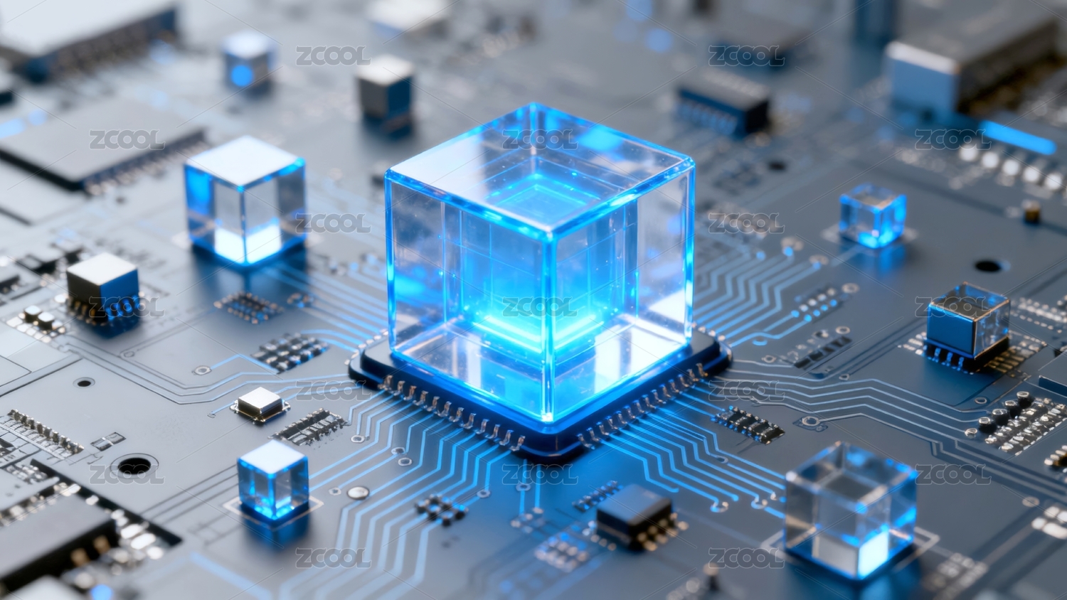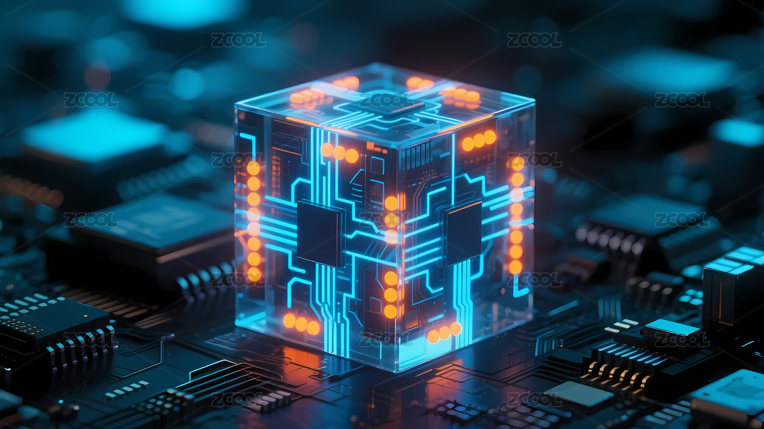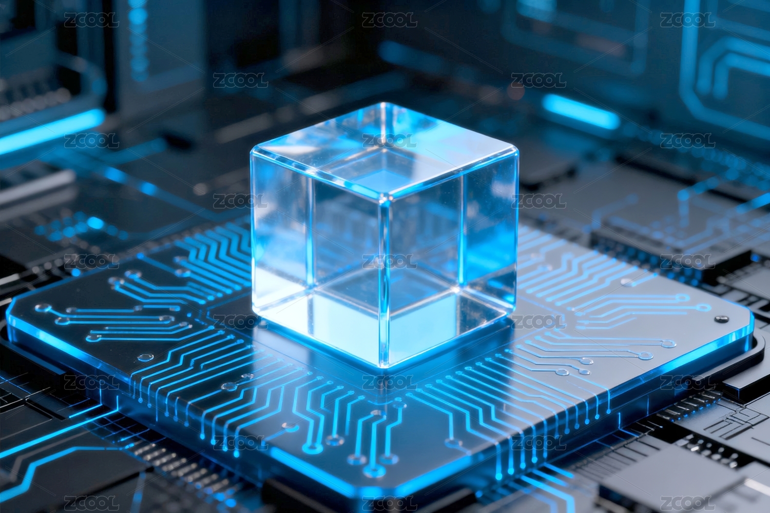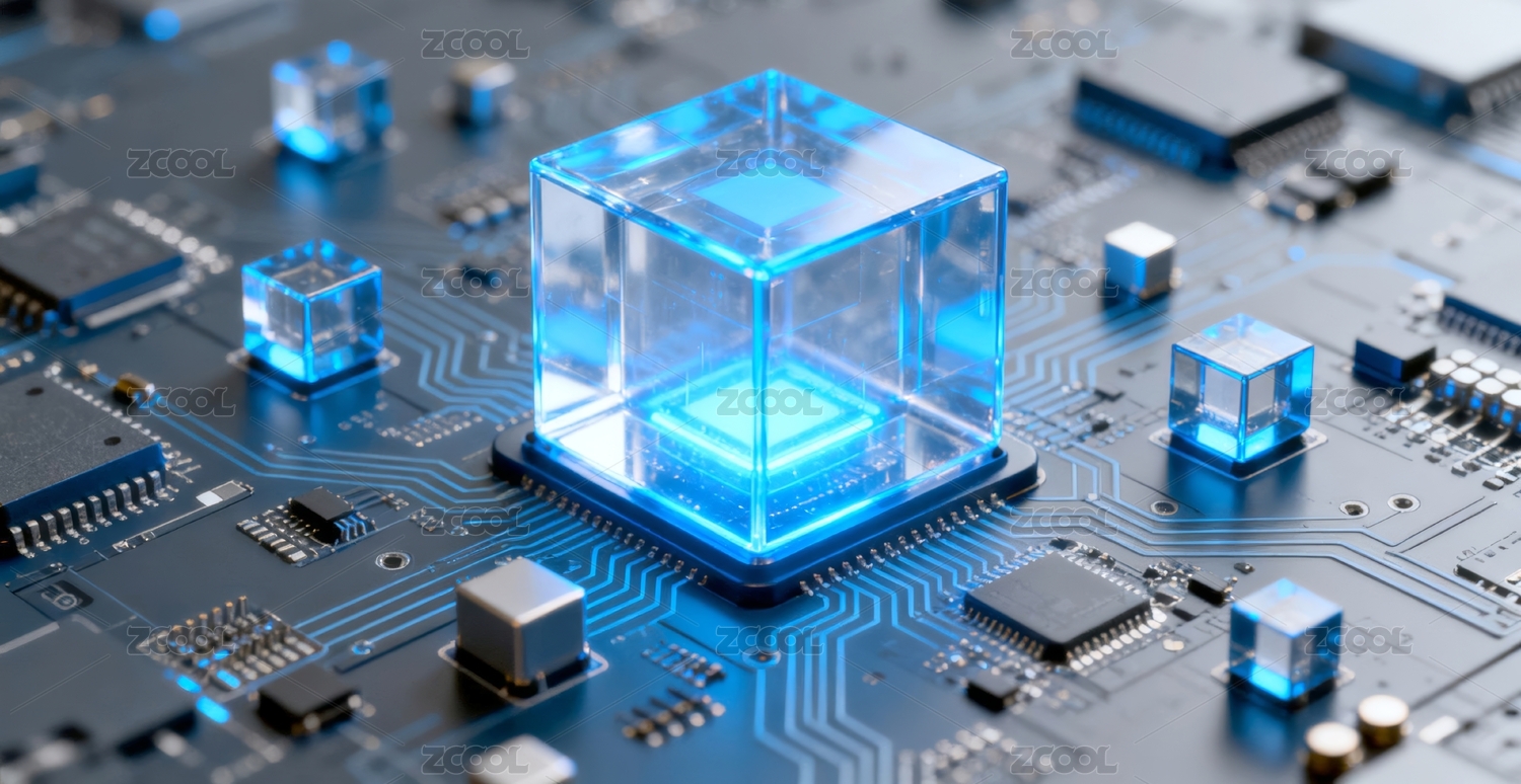 科技感电路板上蓝色发光智能立方体
