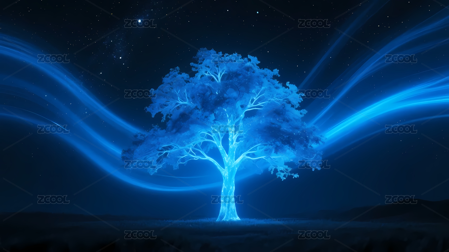 神秘,自然,蓝光,宁静,光影,星星,夜空,巨树,橙光,奇幻