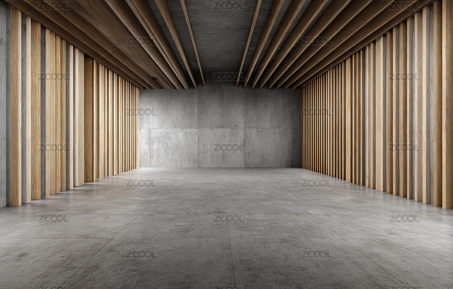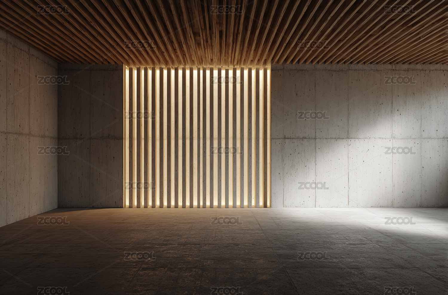 木质条纹墙面的混凝土空间