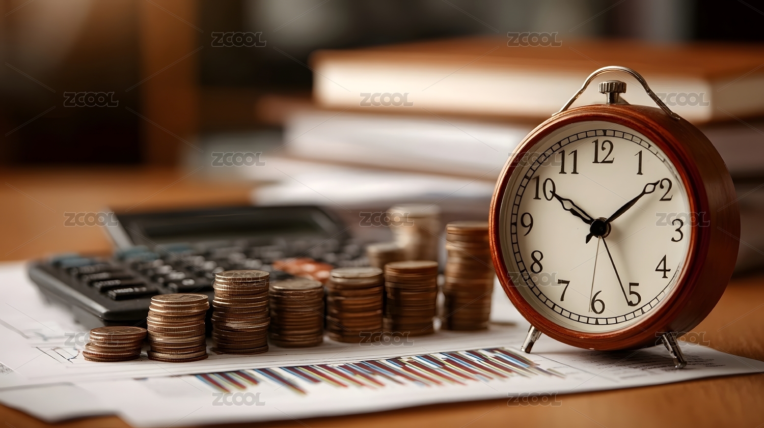 金色闹钟与硬币堆