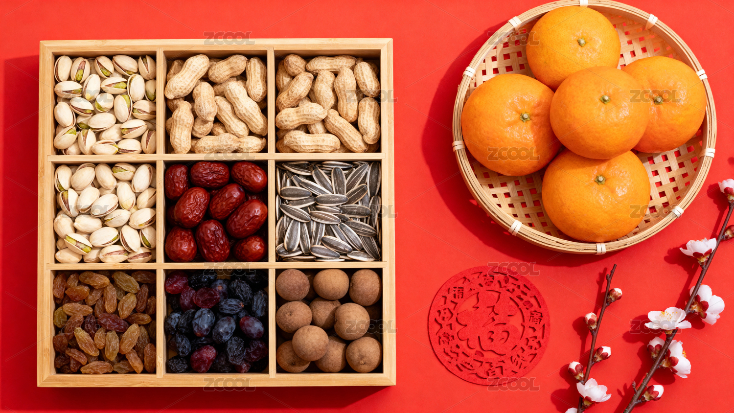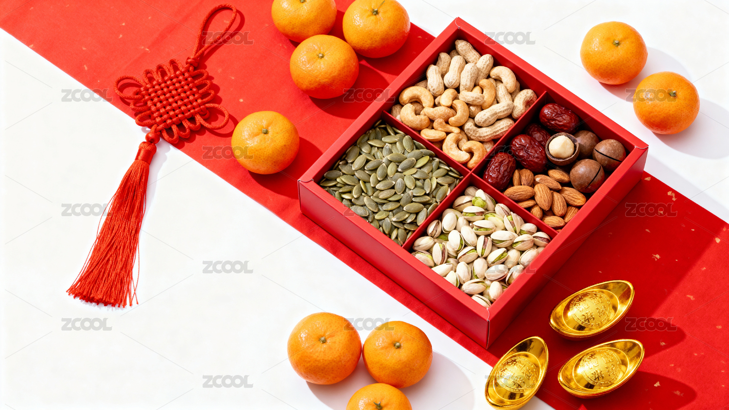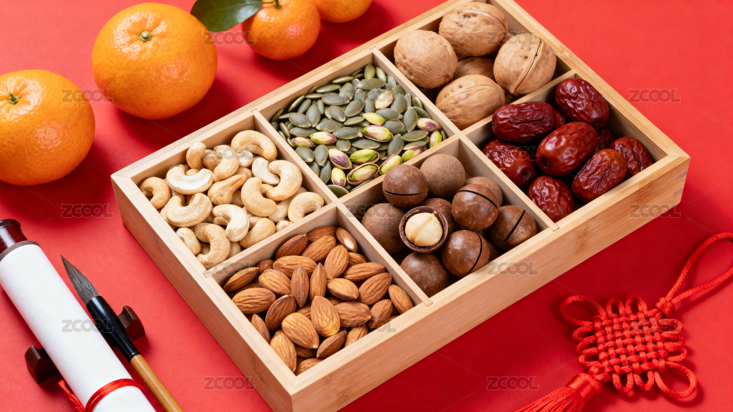 装饰,节日,红色,喜庆,新年,摆放,卷轴,毛笔,柑橘,坚果