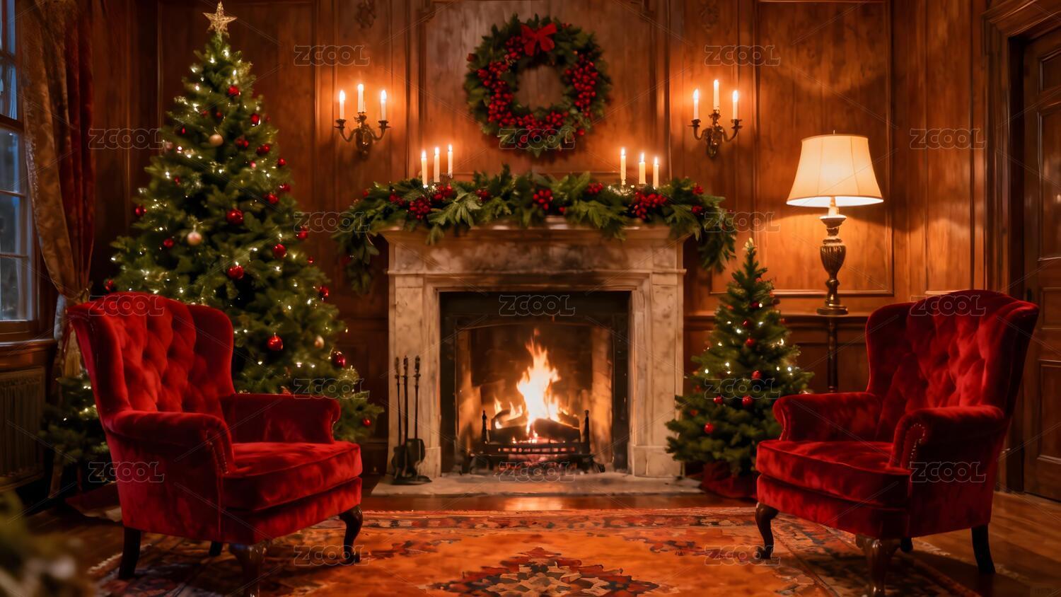 节日,圣诞树,礼物,红色,彩灯,壁炉,火焰,窗户,灯光,室内