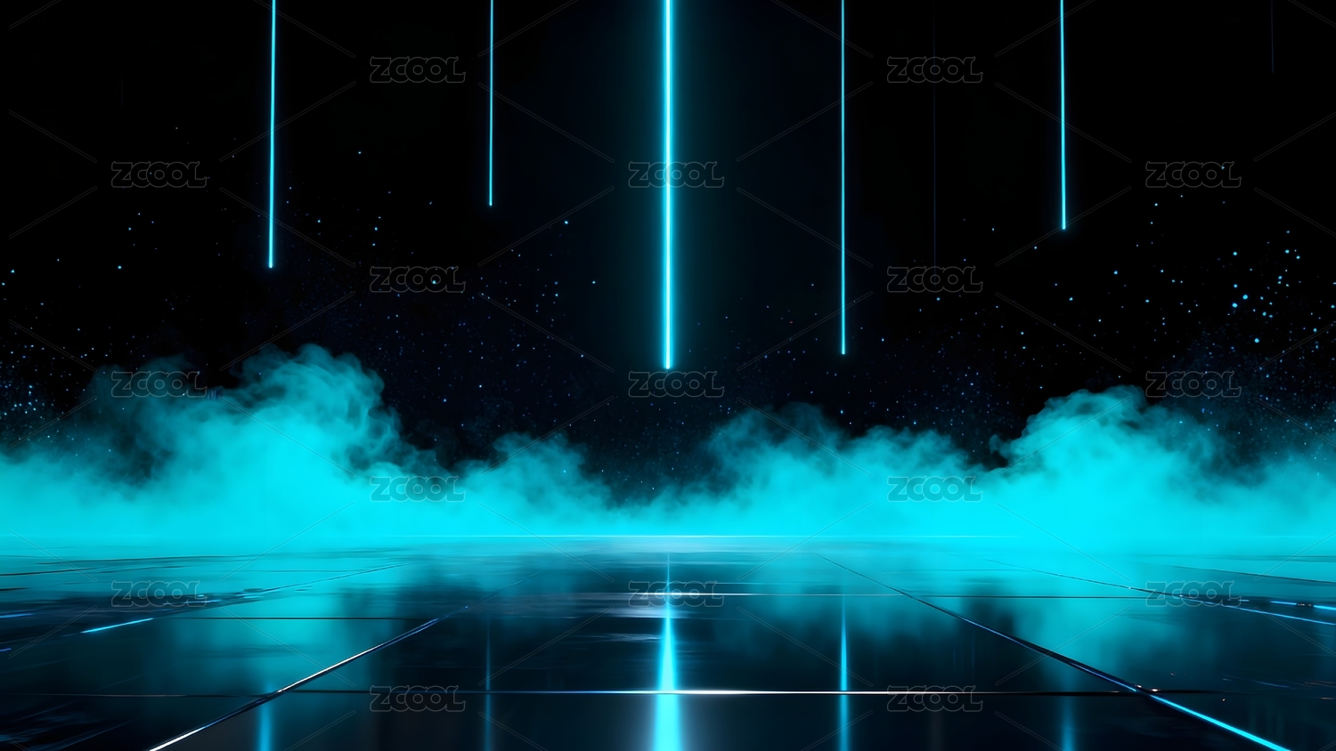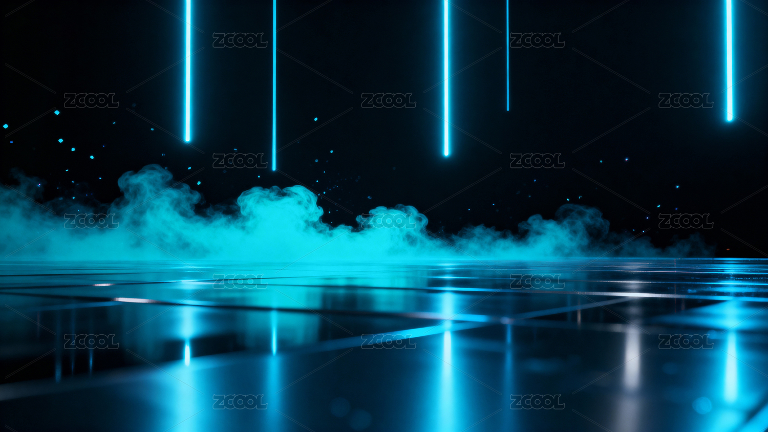 蓝色霓虹光柱与烟雾弥漫的未来空间
