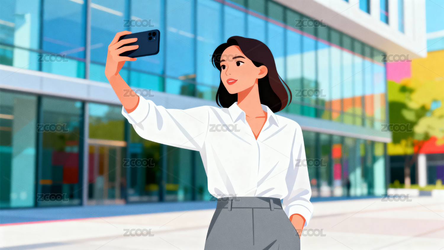 女子户外自拍现代建筑背景