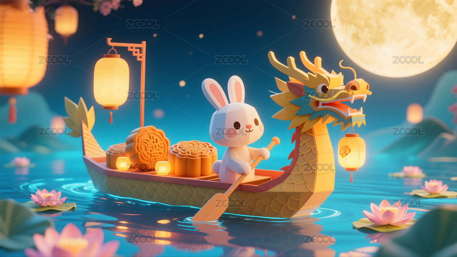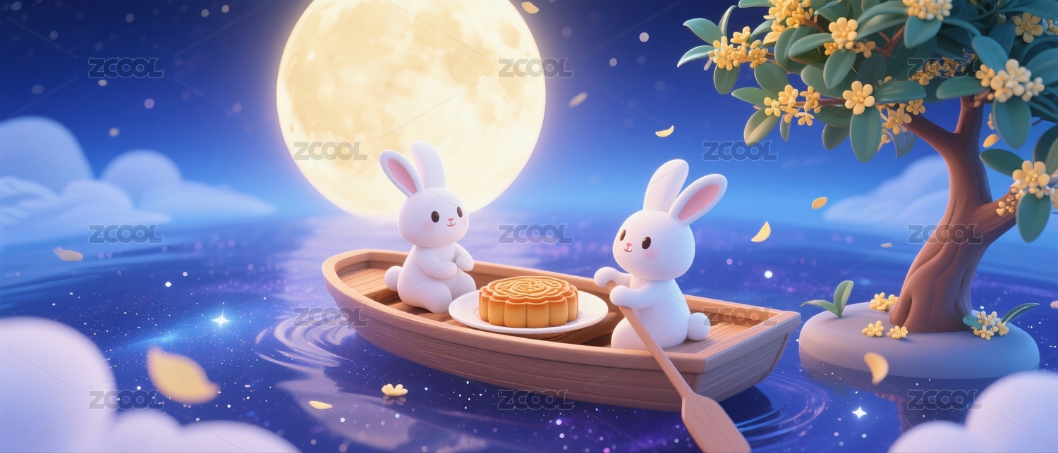 三维,3D,中秋节,月饼,食物,满月,玉兔,兔子,月亮