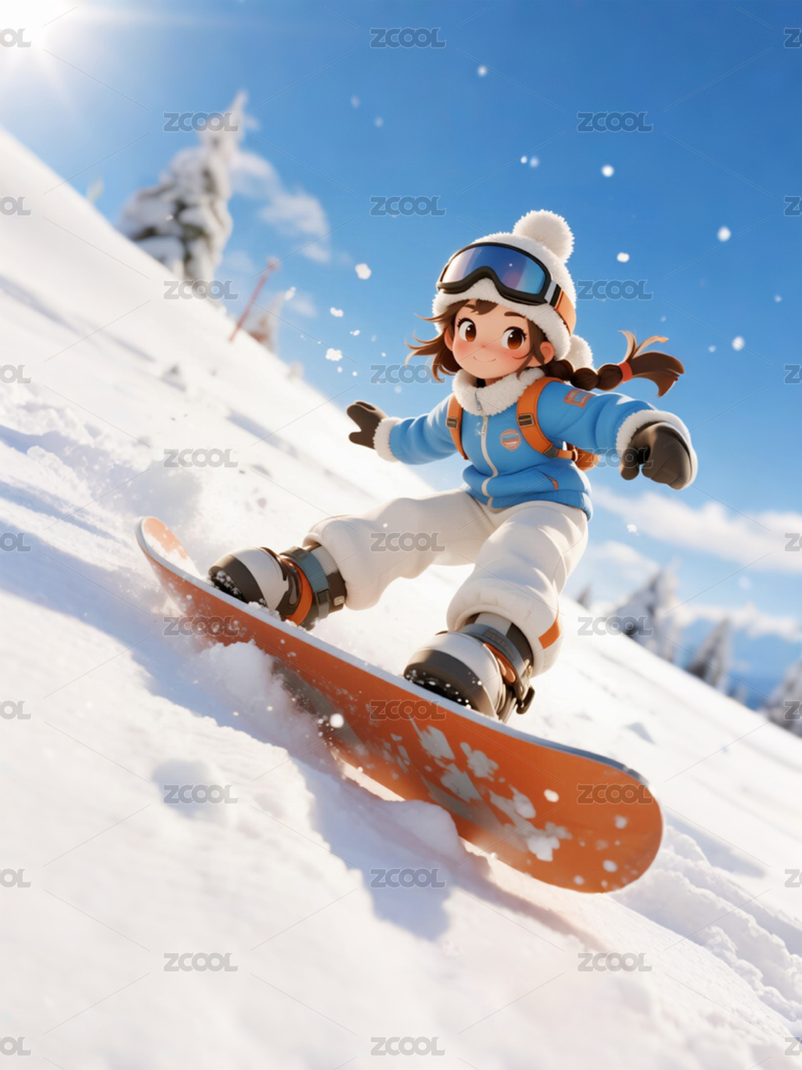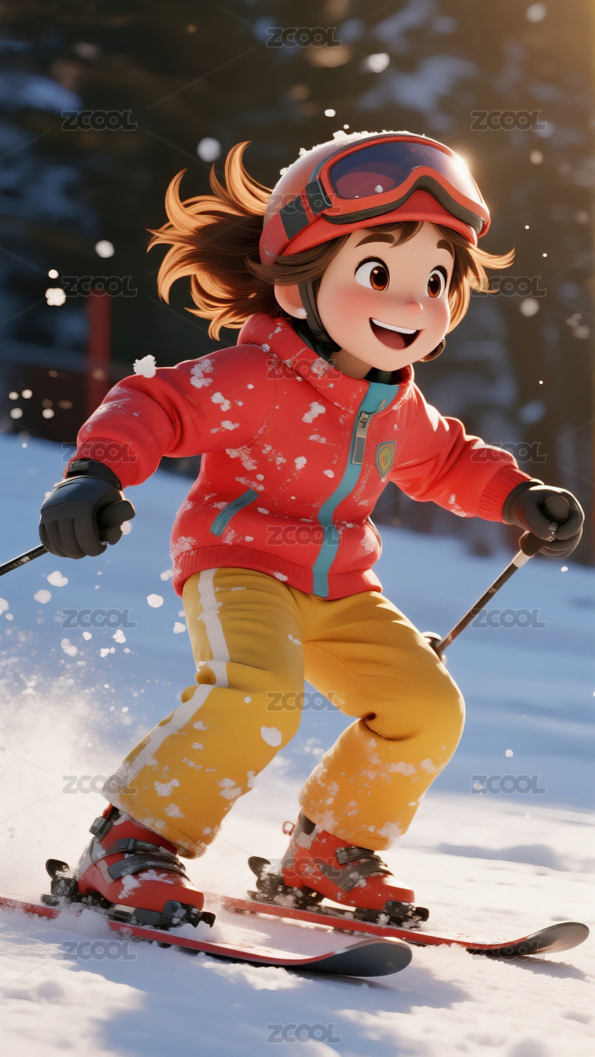 3D卡通风格,一个滑雪的女生