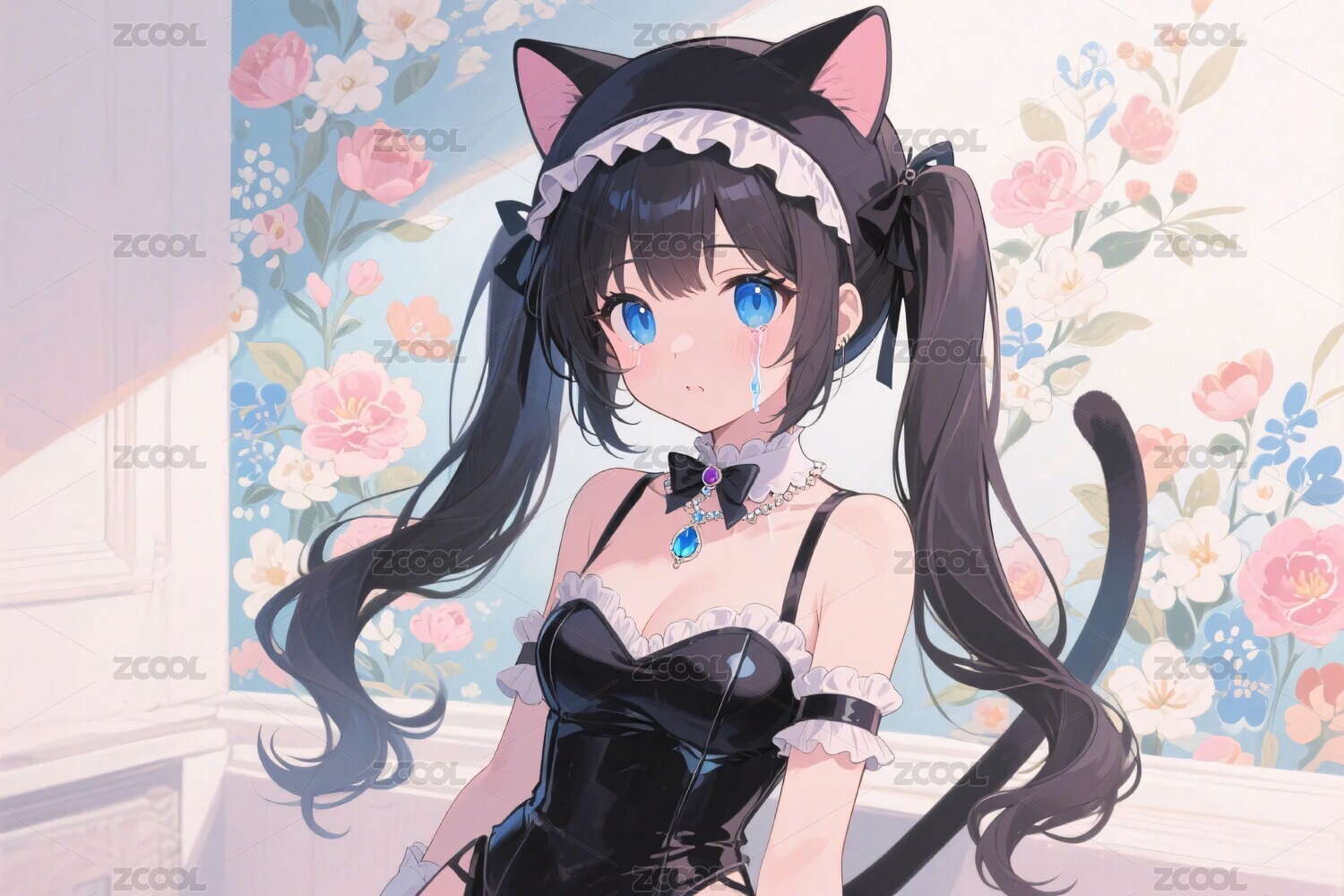 少女,猫耳,花朵,动漫,插画,猫耳装饰,背景花墙,女生,二次元,图案