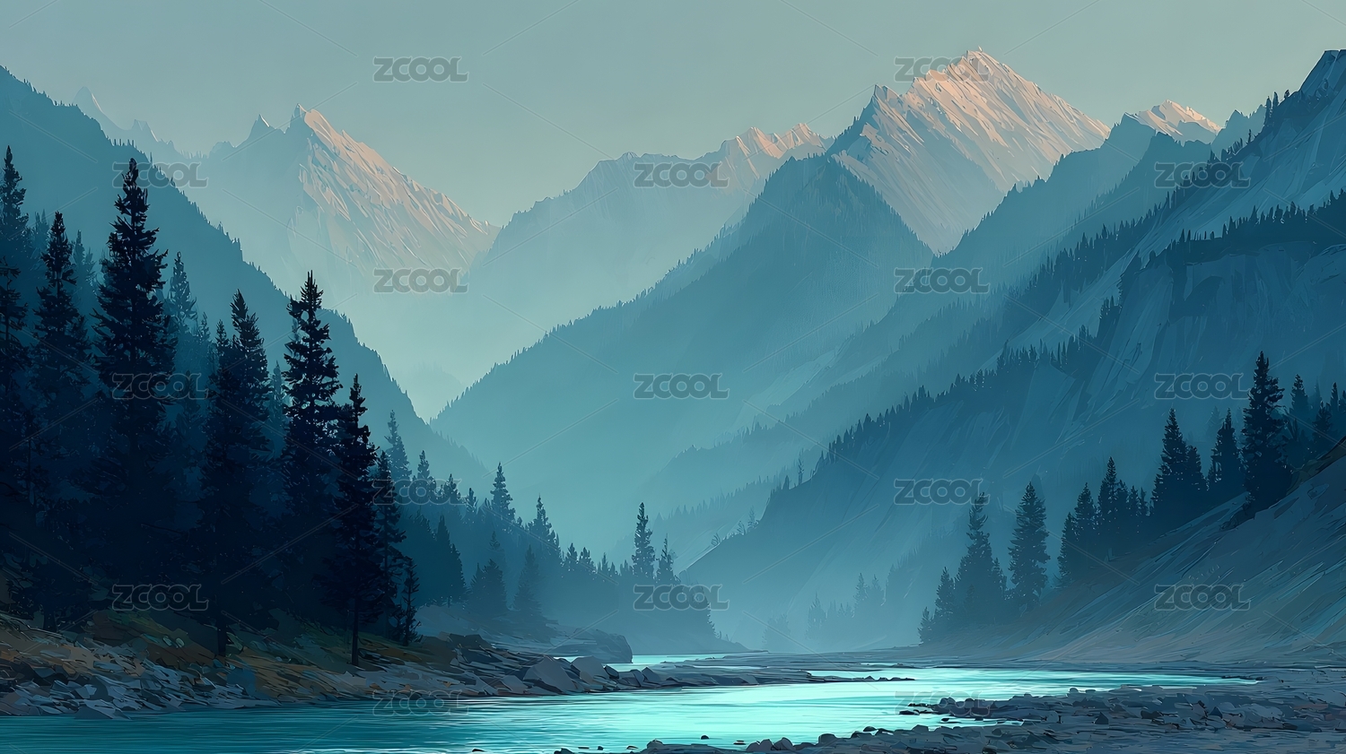 河流,山脉,冰川,森林,云雾,山水,风景,自然,景观,插画