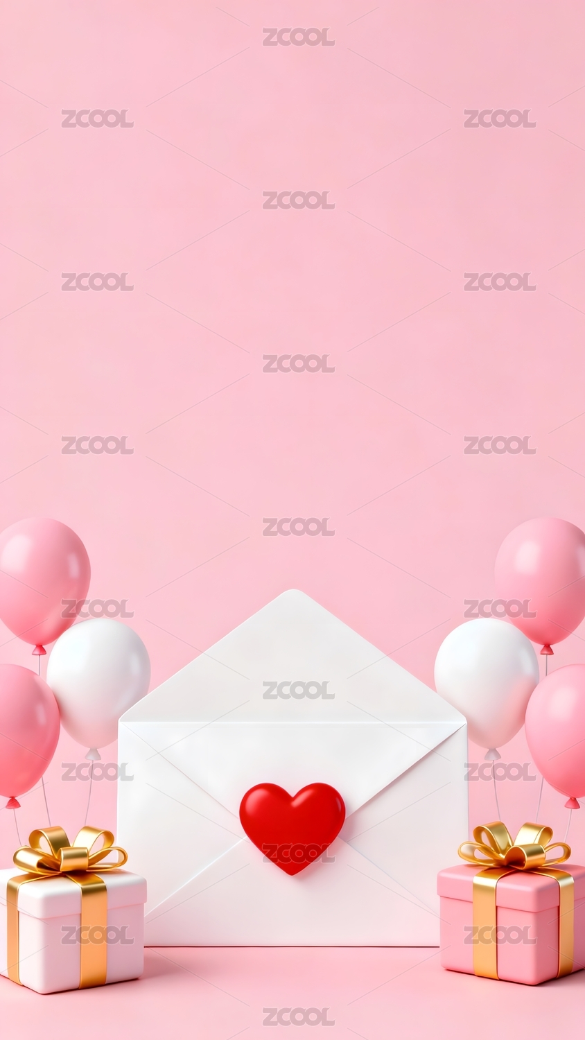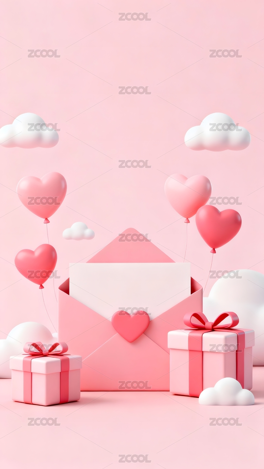 粉色系爱心气球与信封礼物场景