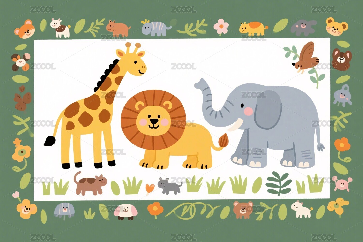 老虎,火烈鸟,长颈鹿,鳄鱼,蝴蝶,大象,彩虹,花朵,童趣,卡通