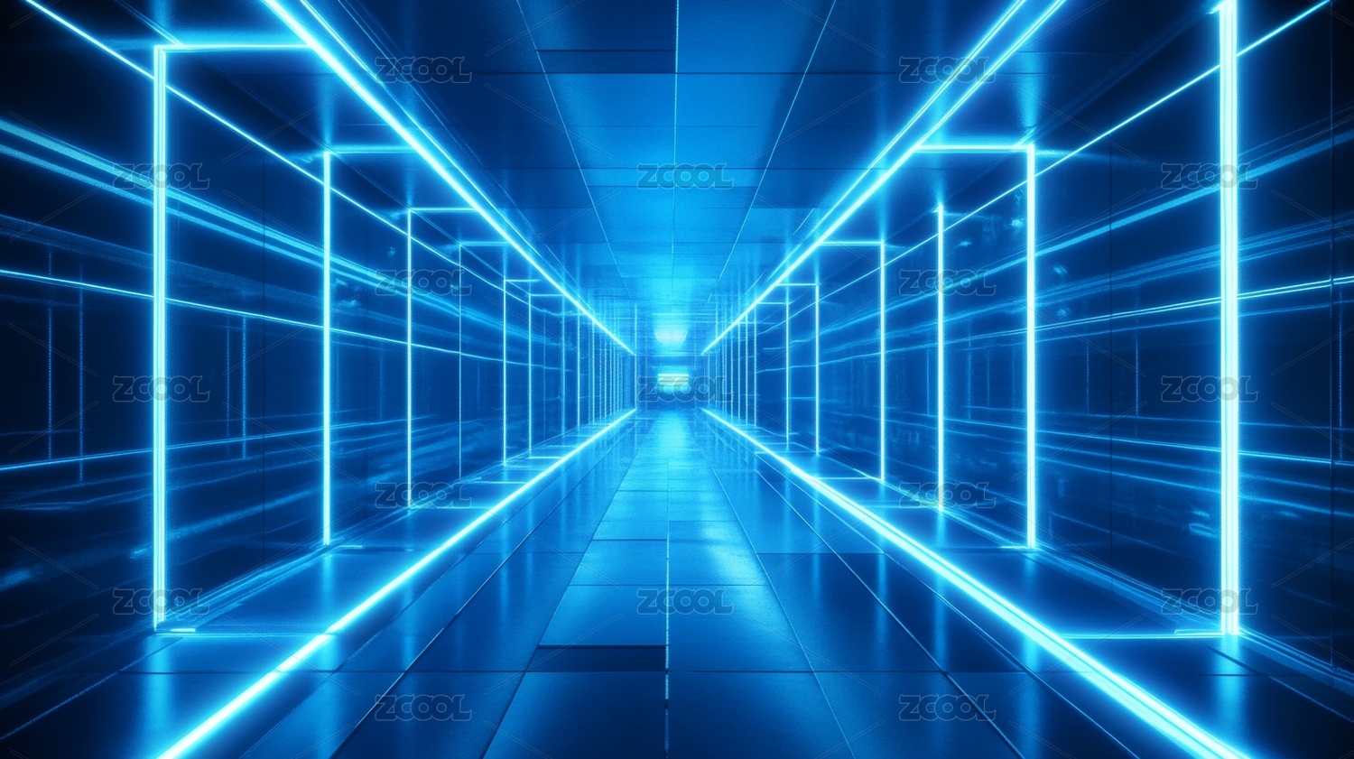 蓝色霓虹灯走廊的未来感空间