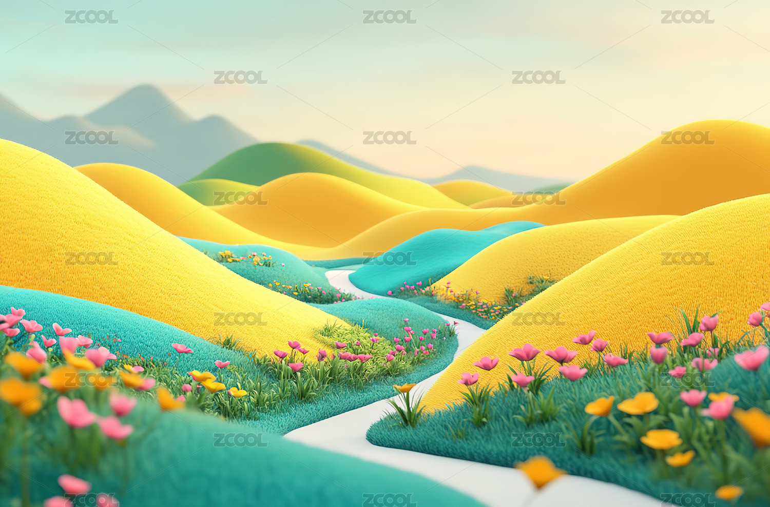 航拍视角蜿蜒的河流绿色的山脉3D插画