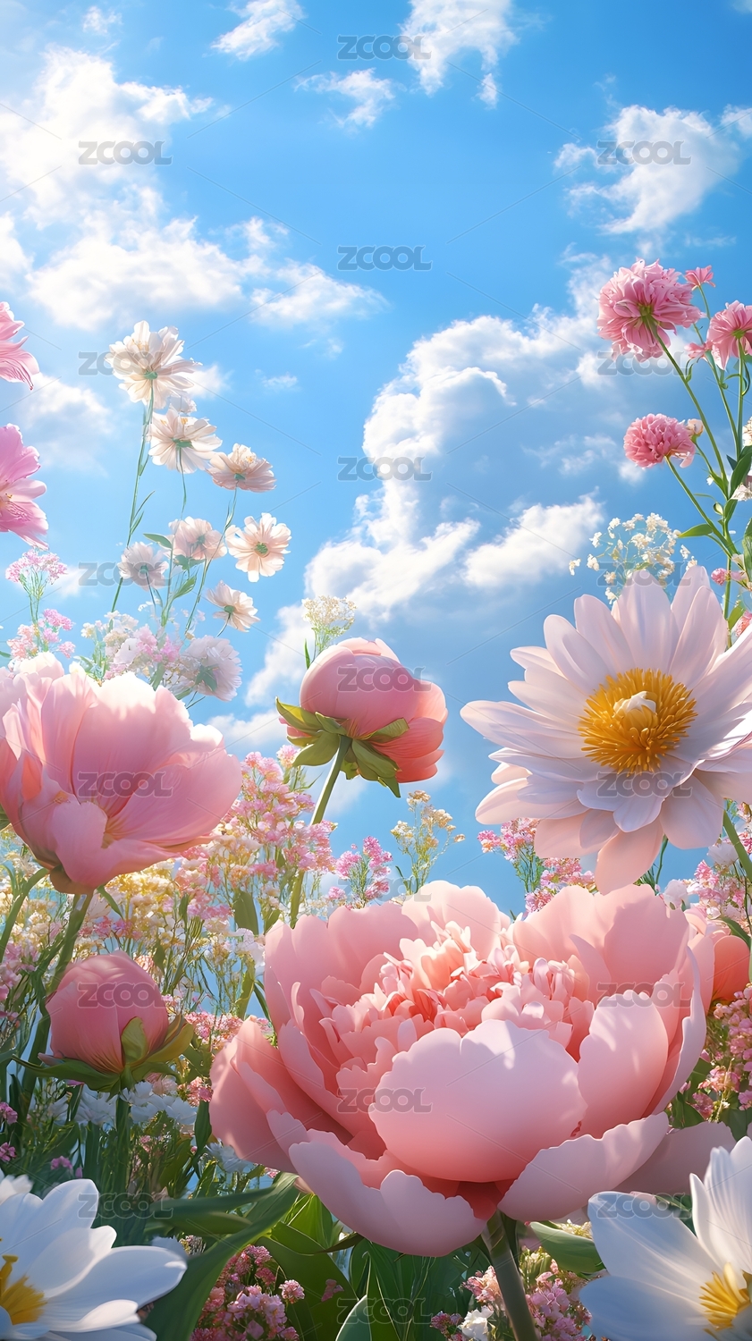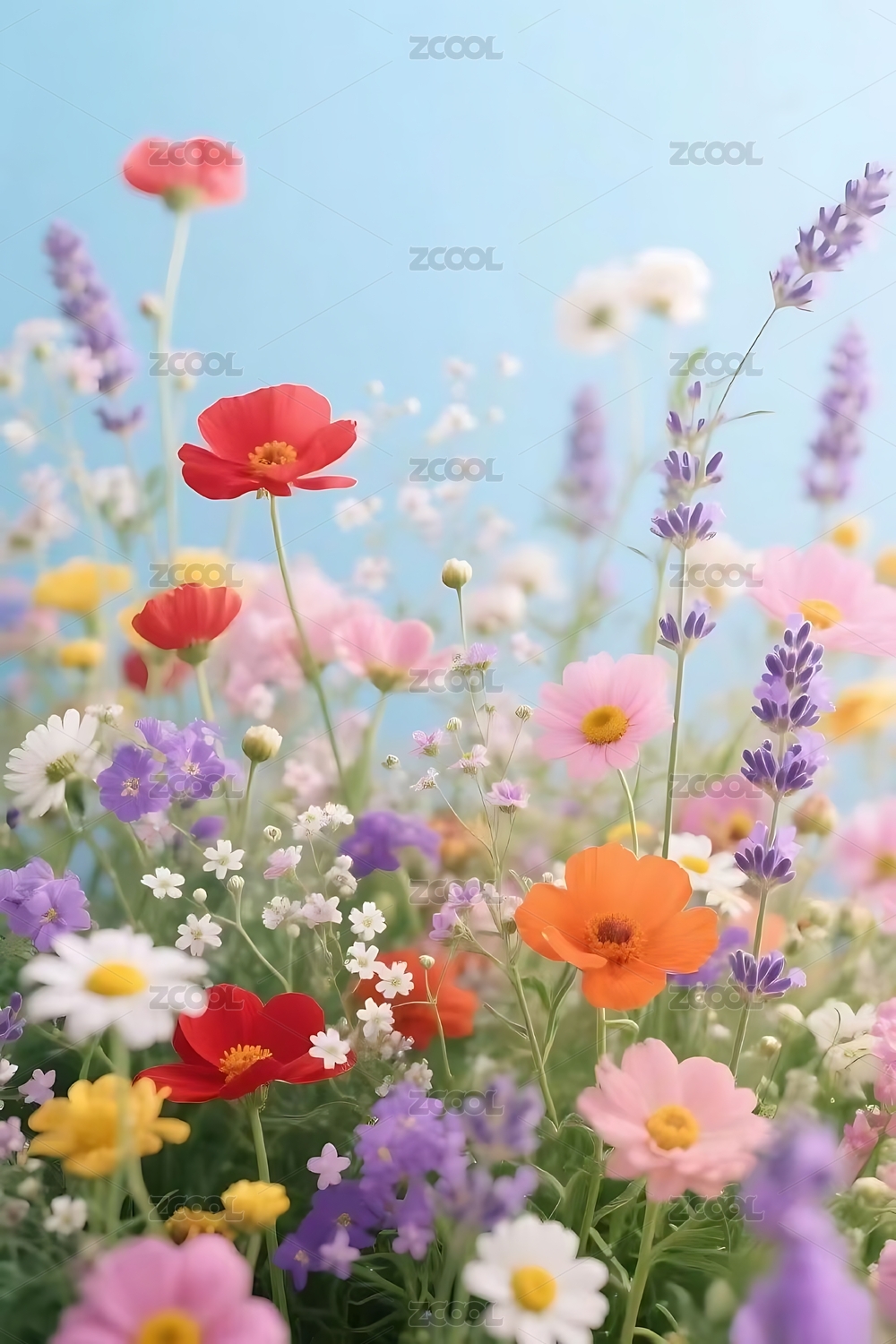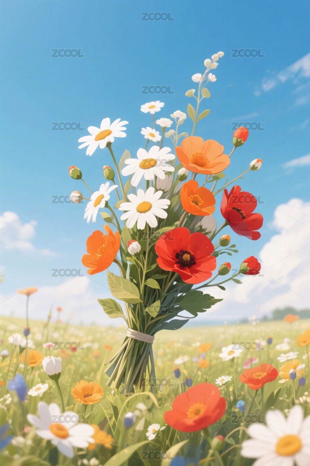花卉,花朵,橙花,红花,白花,绿叶,蓝天,草地,田野,插画