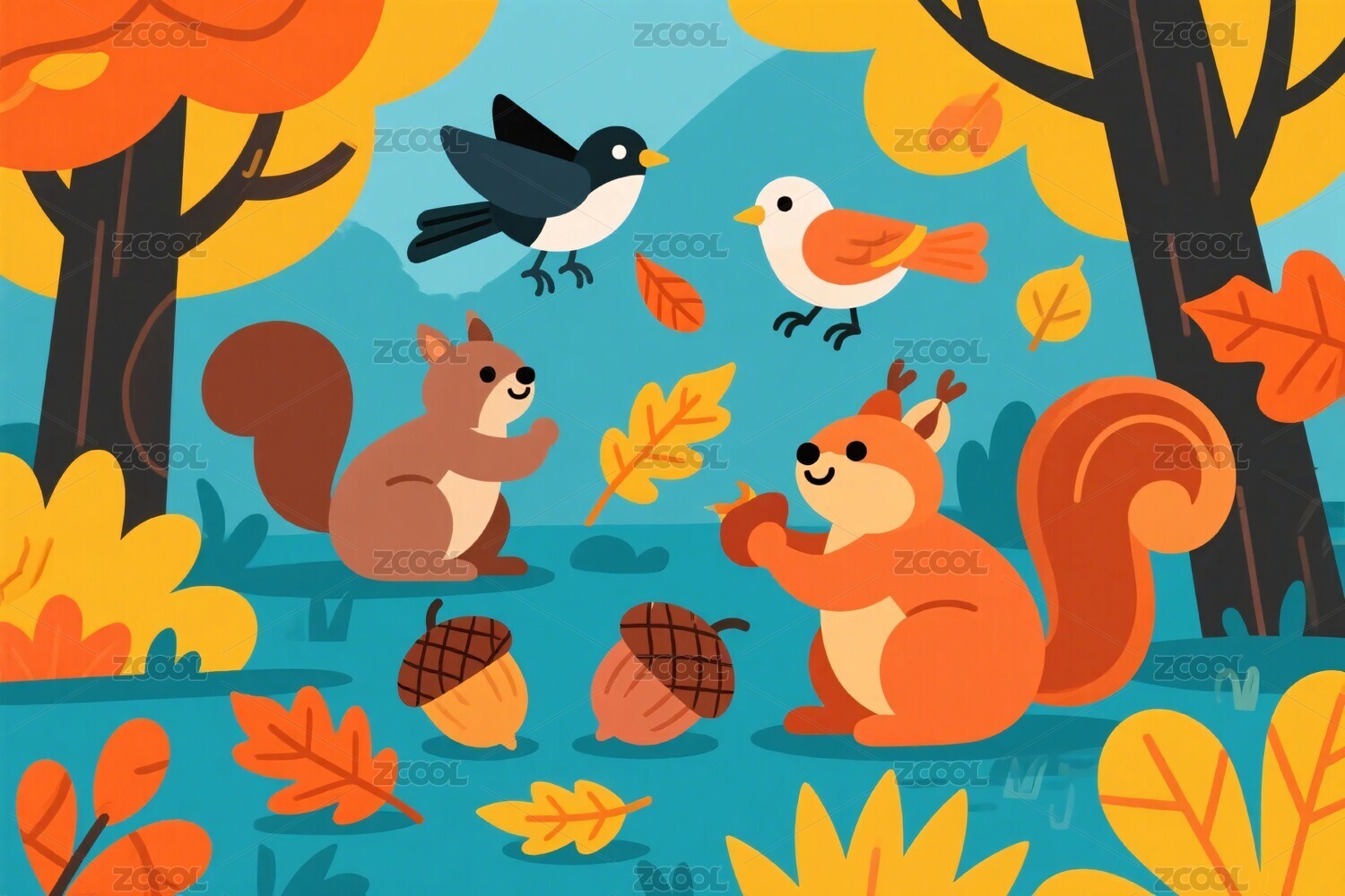 秋日松鼠小鸟插画